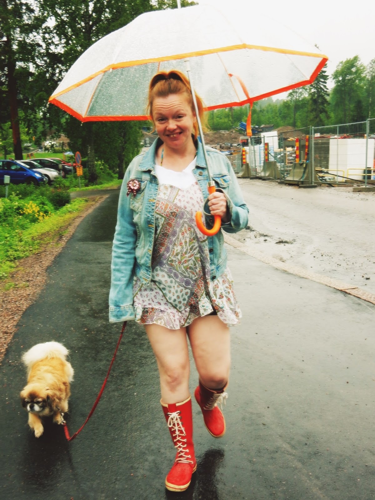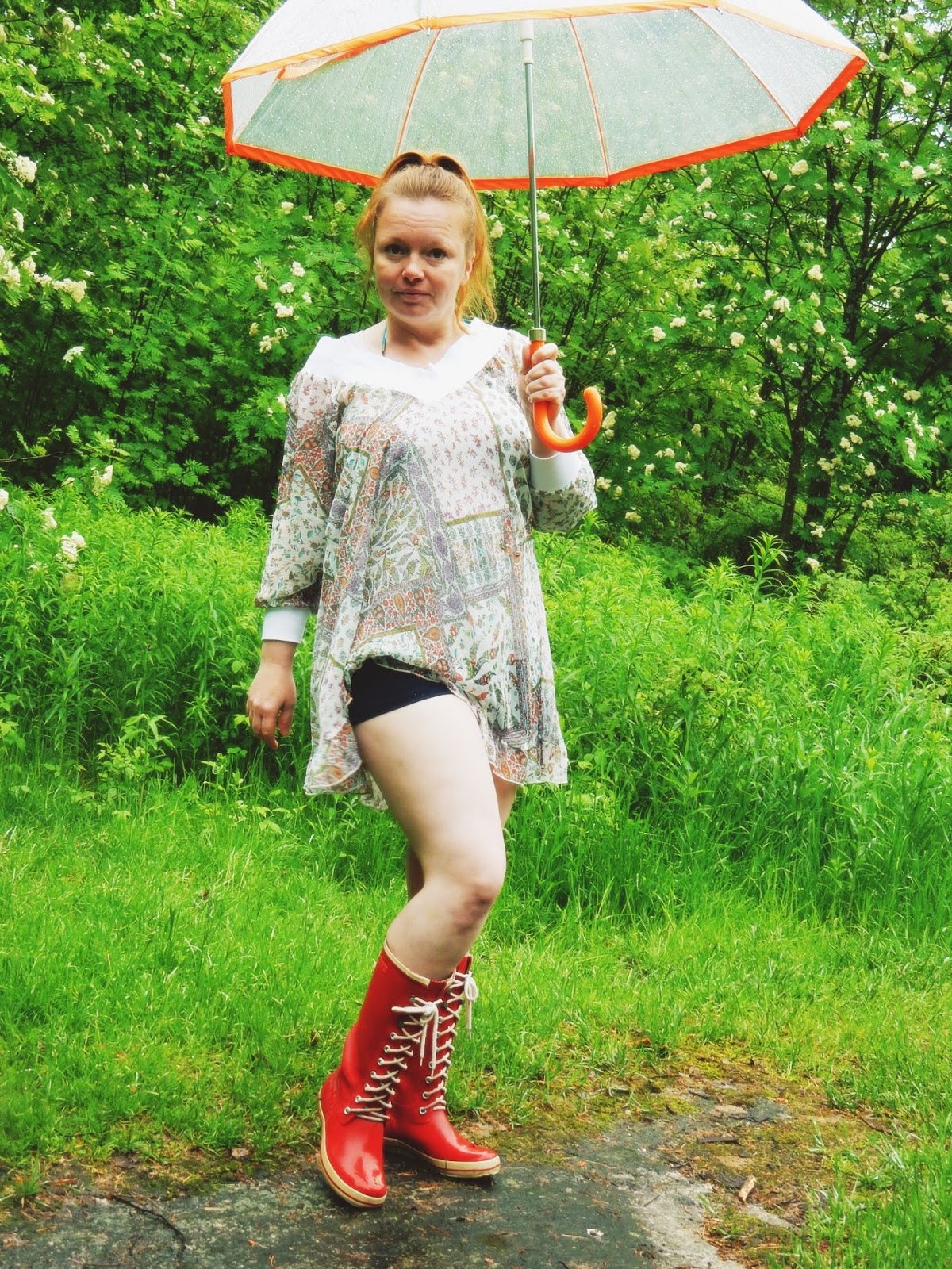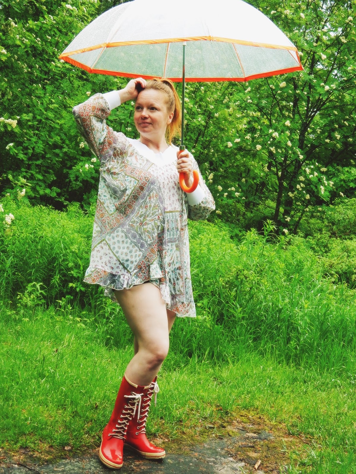 Tänään esittelen mummon sadepäivän asun. Sadepäivät kesällä on oikeastaan aika ihania hetkiä. Sade ropisee parvekkeen ikkuiden takana eikä tee pahaa lähteä koirien kanssa lenkille aamusta. Kun sade hiukan lakkaa niin ihanan raikas tuoksu valtaa kodin kun avaa ikkunan ja lintujen laulu kaikuu joka puolella raikkaana kaikuna. Kesäsateelle on kiva pukea kevyesti mutta silti niin ettei ihan läpi kastu, varsinkin jos sade on hiukan liian kylmää.