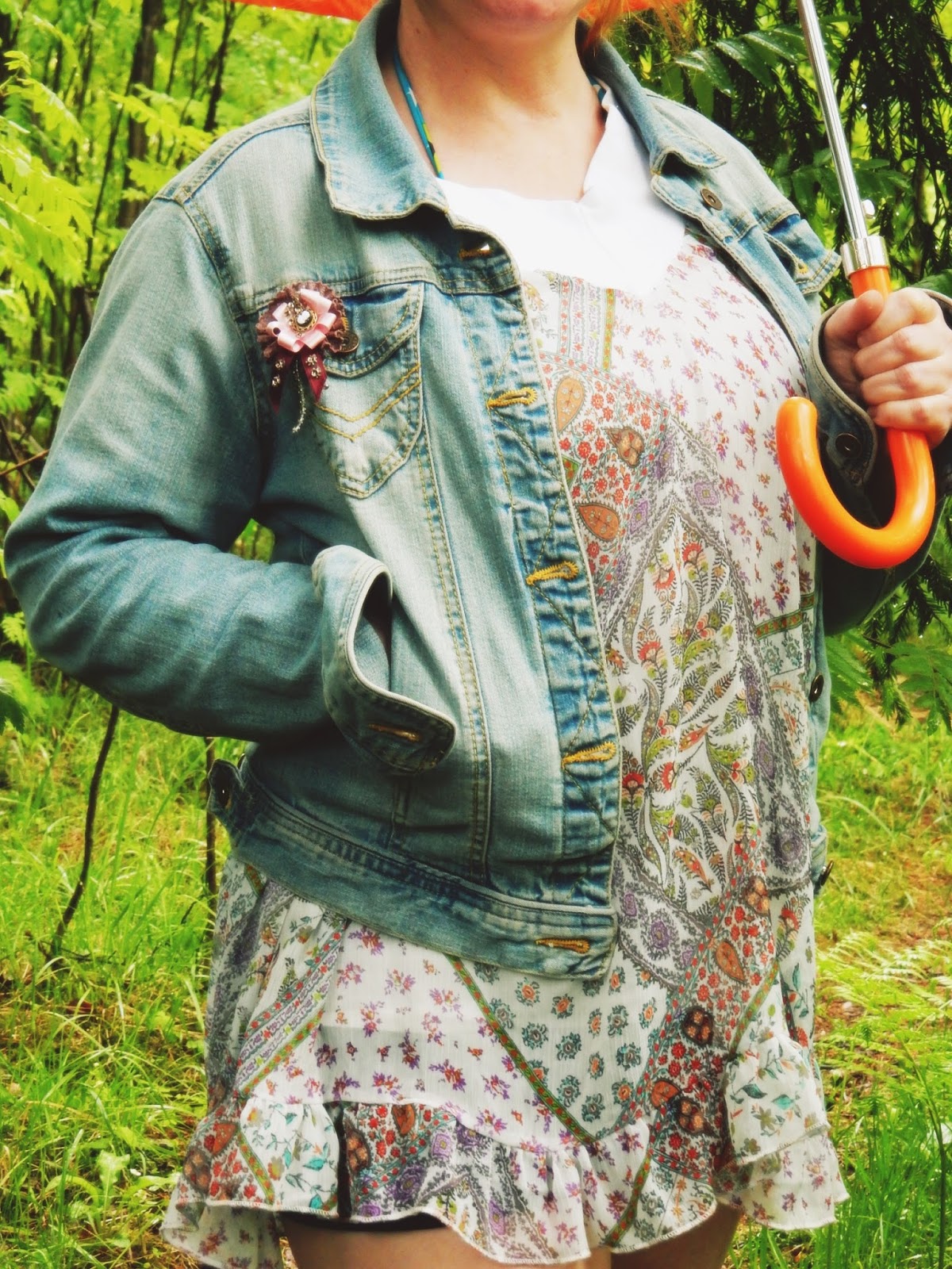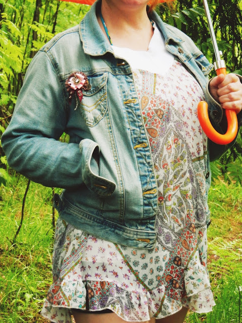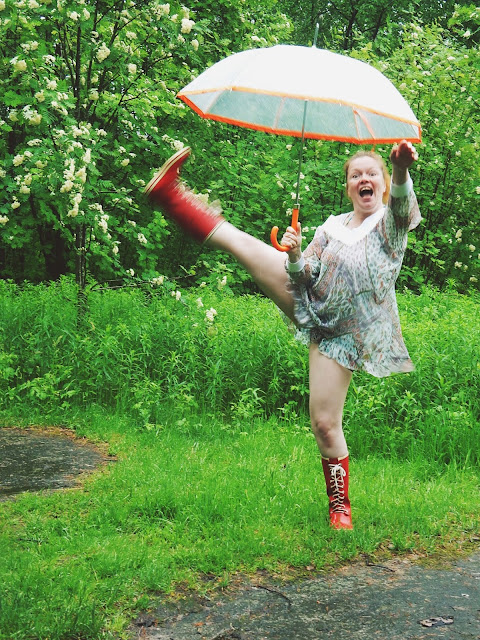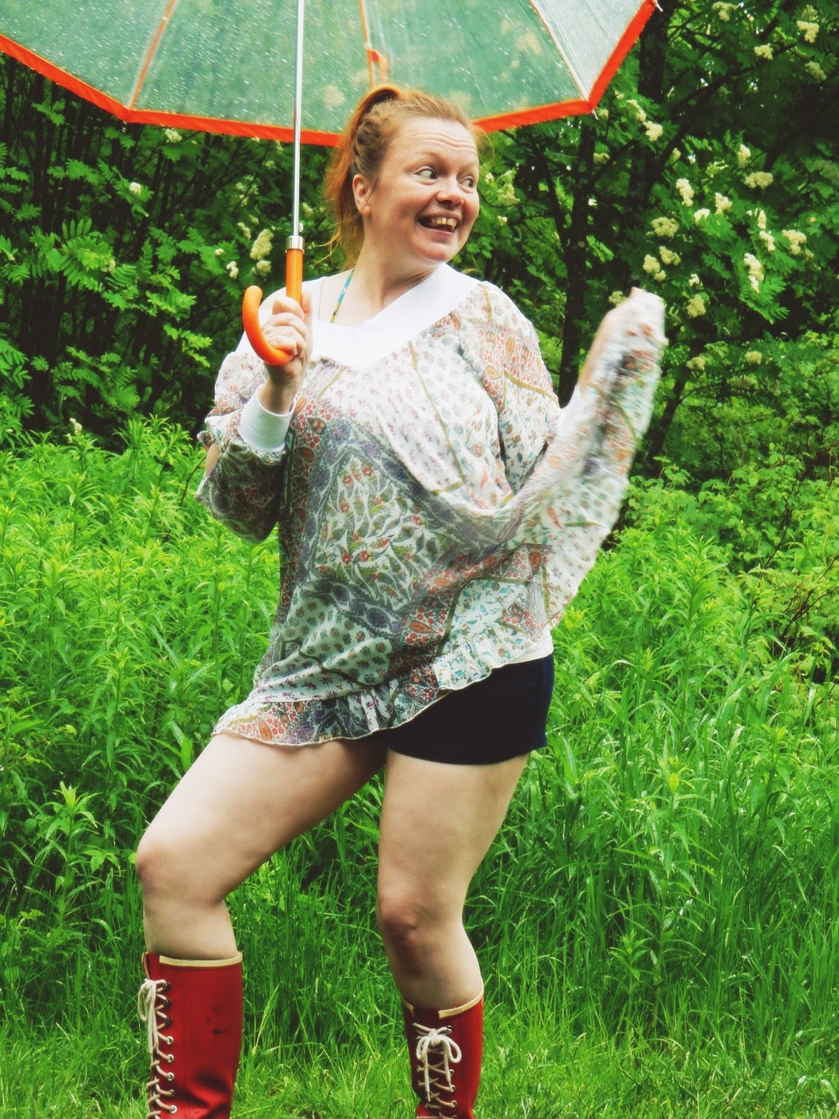 Tänään esittelen mummon sadepäivän asun. Sadepäivät kesällä on oikeastaan aika ihania hetkiä. Sade ropisee parvekkeen ikkuiden takana eikä tee pahaa lähteä koirien kanssa lenkille aamusta. Kun sade hiukan lakkaa niin ihanan raikas tuoksu valtaa kodin kun avaa ikkunan ja lintujen laulu kaikuu joka puolella raikkaana kaikuna. Kesäsateelle on kiva pukea kevyesti mutta silti niin ettei ihan läpi kastu, varsinkin jos sade on hiukan liian kylmää.