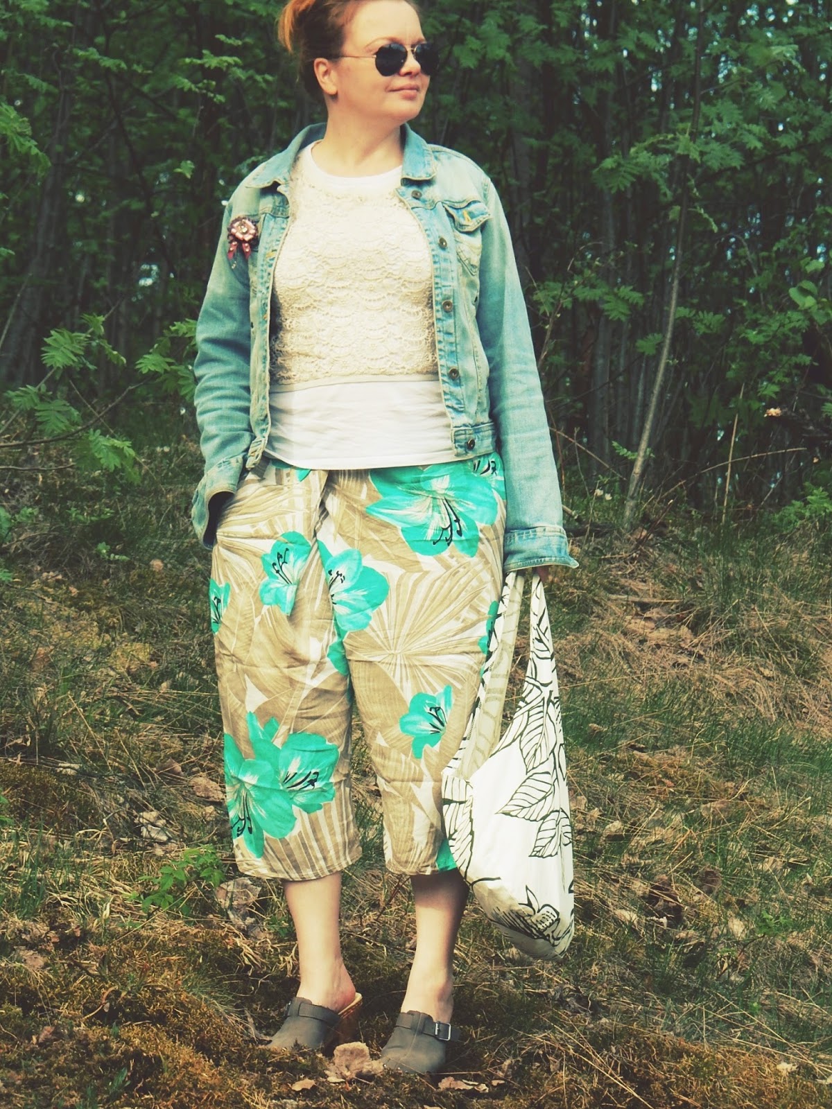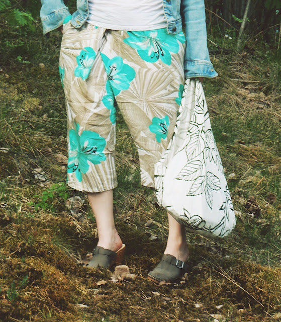 Vuosi sitten kesällä kaivoin hameen Kierrätyskeskuksen ilmaisosastolta, kuosi oli kiva ja halusin hameesta ehdottomasti housut. Teinkin housut nopealla tahdilla mutta kuvat jäivät ottamatta, sillä kuvattavaa oli viime vuonna valtavasti. Tässä vuoden touhuissa on käynyt myös niin, että alkuperäinen kuva hameesta on kadonnut jonnekkin, uusi asia tämä ei ole sillä lähes kaikkien vanhojen tuunausten alkuperäiset kuvat ovat kadonneet. Olen jemmannut ne jemma nimiseen paikkaan.