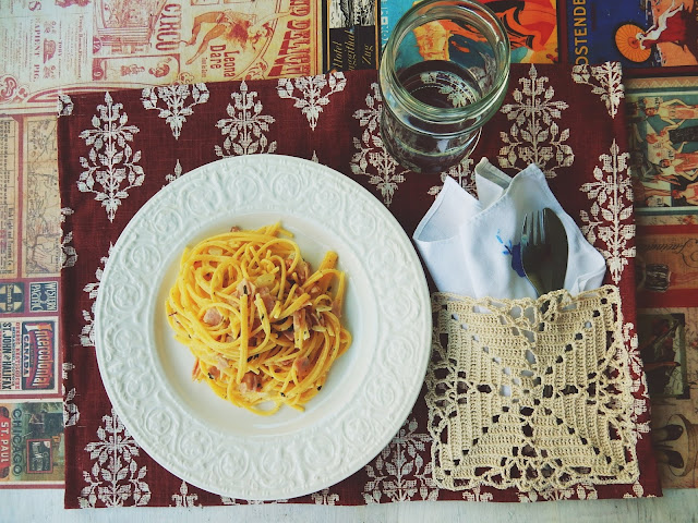 Pöytätabletit pöydälle valmistuu helposti erilaisista kankaanpalasista. Pöytätabletteihin on ommeltu myös virkatut liinat taskuiksi, johon voi kattauksessa sujauttaa servetin sekä aterimet. Tykkään tämän tapaisista pöytätableteista paljon.