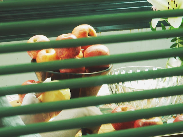 Meillä juhannus alkoi niin, että haettiin raparperia ja omenoita, joista oli tarkoitus tehdä omena-raparperi tuoremehua. Kahteen pullolliseen menee omenia 3kg ja raparperia 2kg, ihan näin isoja määriä ei aina tarvitse tehdä mutta juhannusmehua pitää olla pöydässä. Mäskiä, kuitu, jota jää mehun puristamisesta ei kannata heittää pois vaan siitä saa tehtyä vaikka mitä. Itse leivoin mäskistä kaksi leipää, jotka melkein jo syötiinkin, lapset söivät ja loppu mäskiin laitoin ison annoksen sokeria ja tein makean piirakan, mäski muuttui sokerin avulla hiukan siirapin makuiseksi ja toimi erittäin hyvin tuossa minun piirakassani. Myös omenan kuoret voi säästää, kerron myöhemmin mitä omenan kuorista voi tehdä.