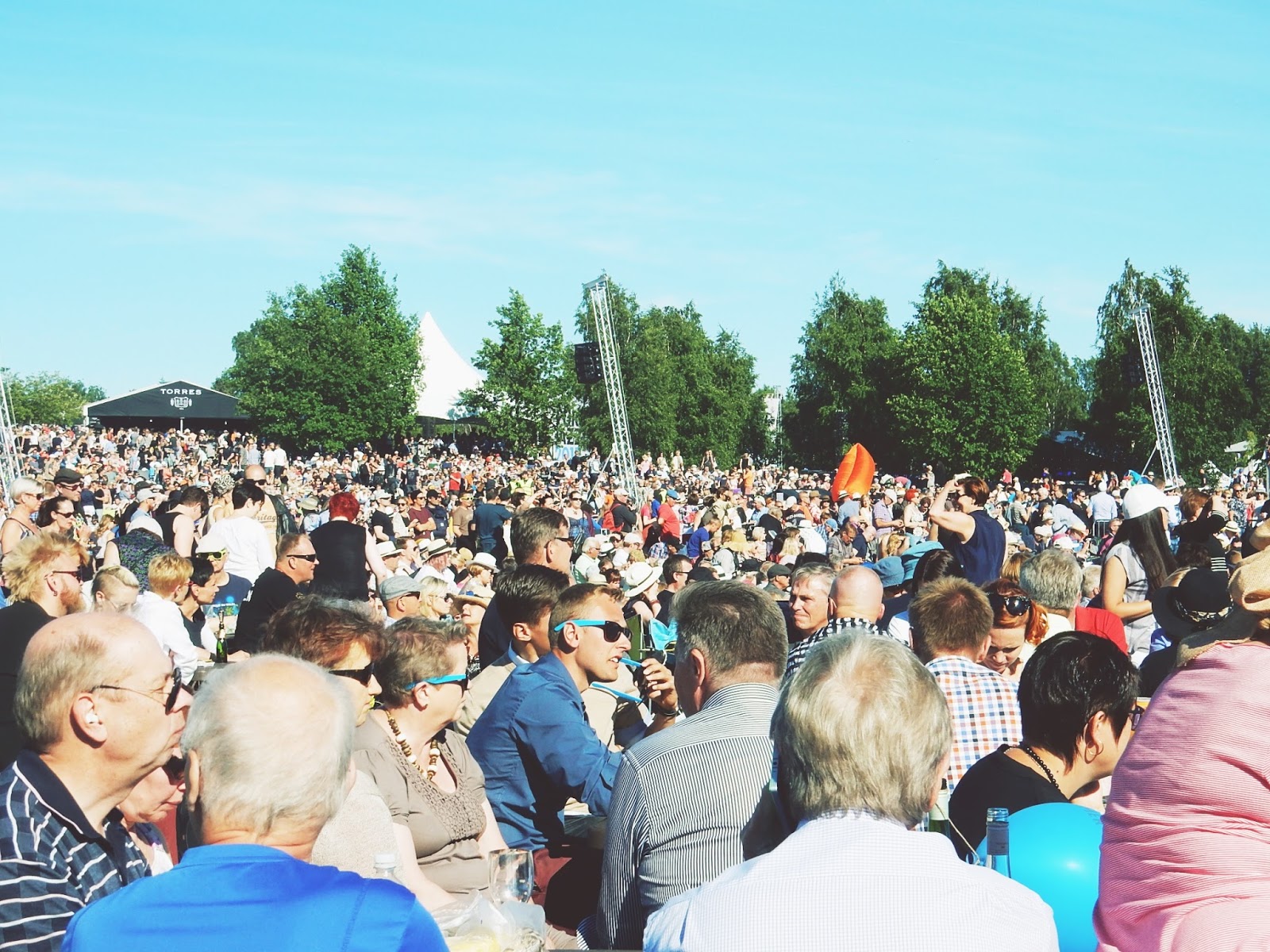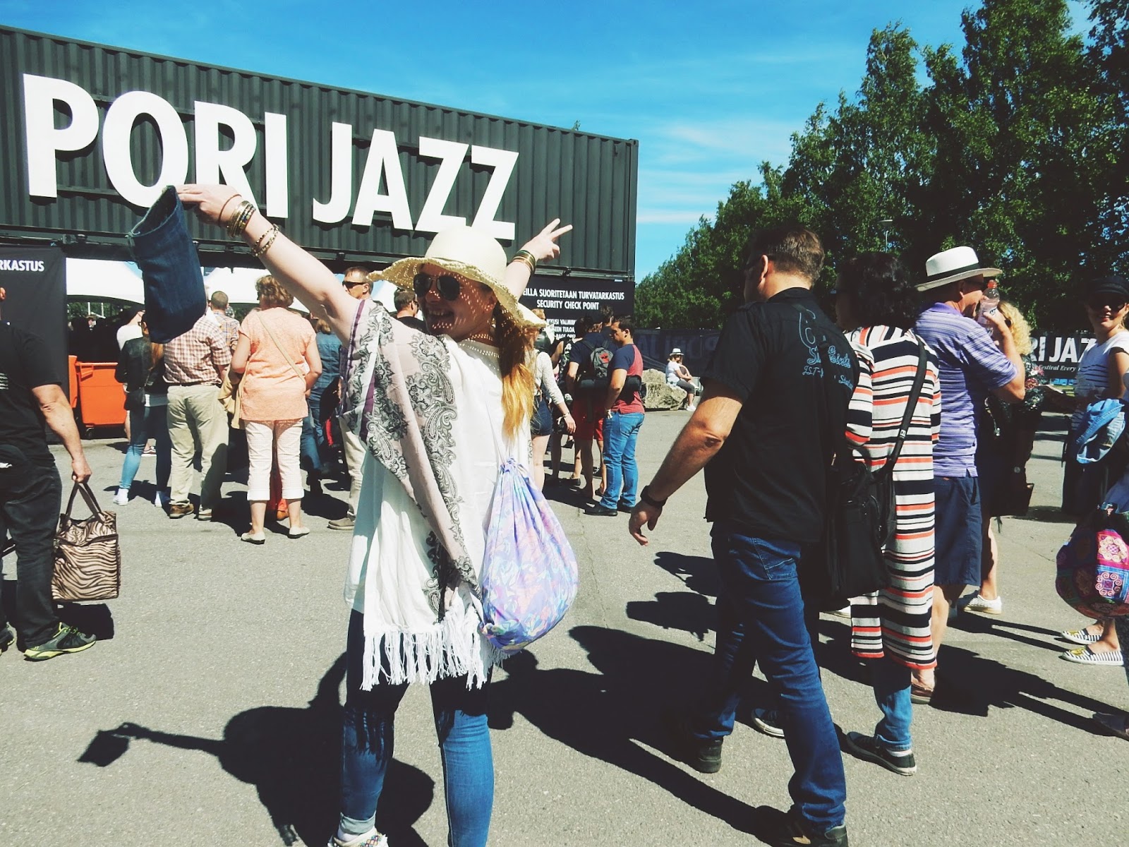 Kävelimme alueella hitaasti, pysähdyimme kuuntelemaan sivulavojen soundeja ja katselimme ihmisiä ympärillämme. Live-musiikki Porin Jazzeilla ei vaadi kiirettä. Tänne tullaan olemaan, ei suorittamaan. Istumme maahan peiton päälle ja avaamme viinipullon. Nyt vain nautitaan ihanasta kesästä.