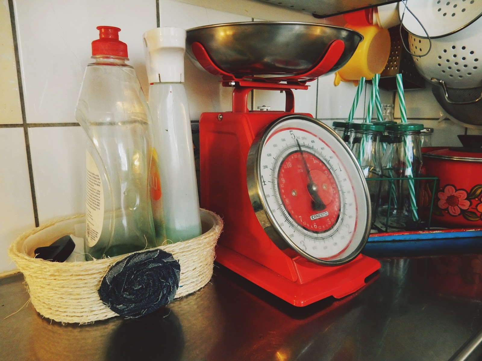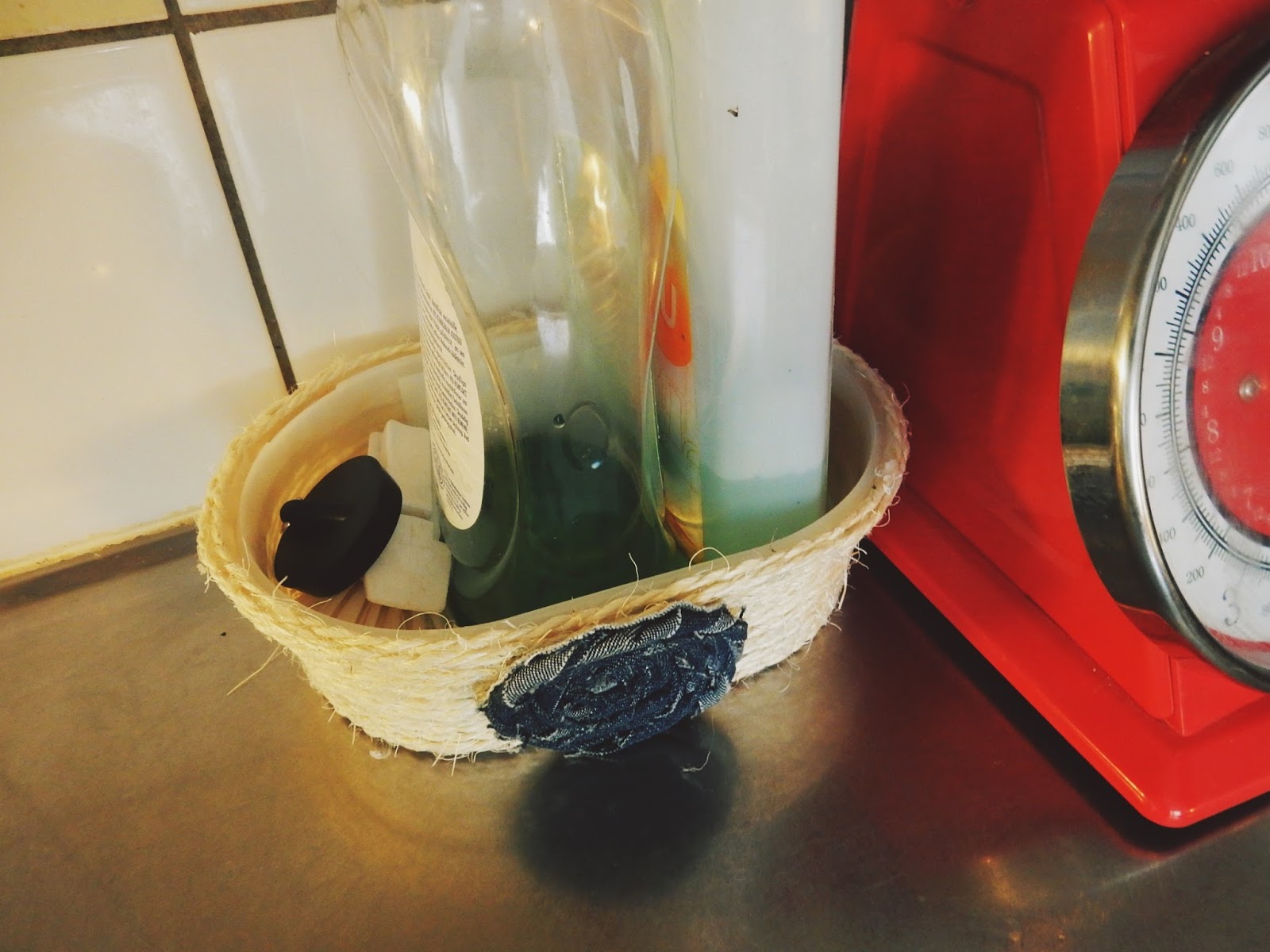 Joskus on säästää asioita vain ihan sen vuoksi, että niitä voi tarvita. Näin täpahtui tällä kerralla ja lopputuloksena oli jäätelöpurkista teline tiskiaineille. Meillä on nimittäin todella hankala säilyttää mitään allaskaapissa.