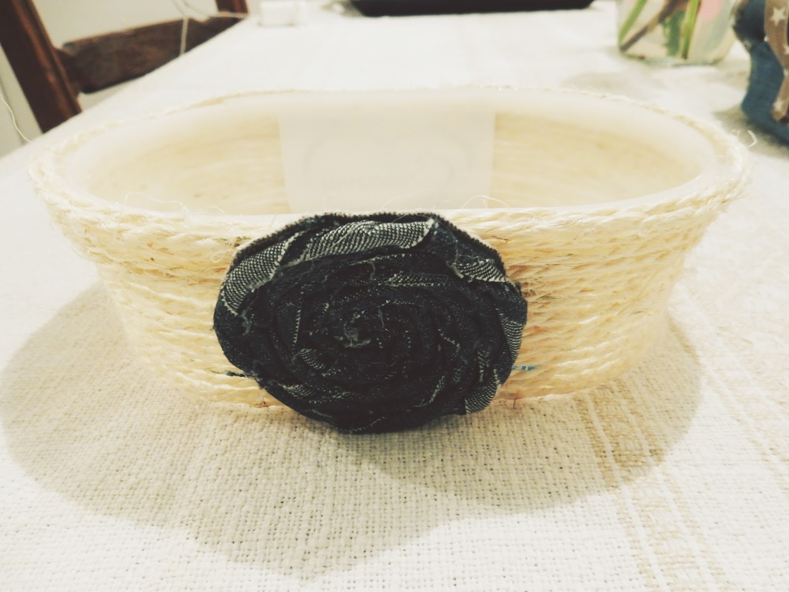 Siihen tarvitaan farkkua. Leikkaa ensin farkusta pyöreä kappale. Sen jälkeen muutama pitkä suikale. Aloita uloimmasta reunasta, laita liimaa reinalle ja liimaa suikaleen pää ensin kappaleen reunaan. Samalla pyöritä suikaletta sormien välissä, jotta se menee kierteelle. Laita liimaa koko ajan kappaleelle kun etenet. Tee koko koriste spiraalina. Keskustaan voi laittaa myös helmen tai napin halutessaan, minä en laittanut tällä kertaa mitään.