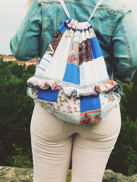 Ei siis pussukka ihan onnistunut niin kuin ajattelin. Eli tilkkutyöt pysyvät minulle mysteerinä edelleen. Ehkä joskus opin miten saan kohdistettua tilkut oikein. Pussukkaan käytin myös erilaisia pitsejä ja koristenauhoja, joita ei pitkiä pätkiä enää ollut jäljellä. Vuori taas on tehty lakanasta, josta tein yöpuvun.