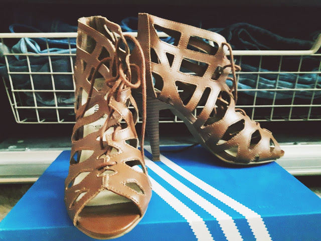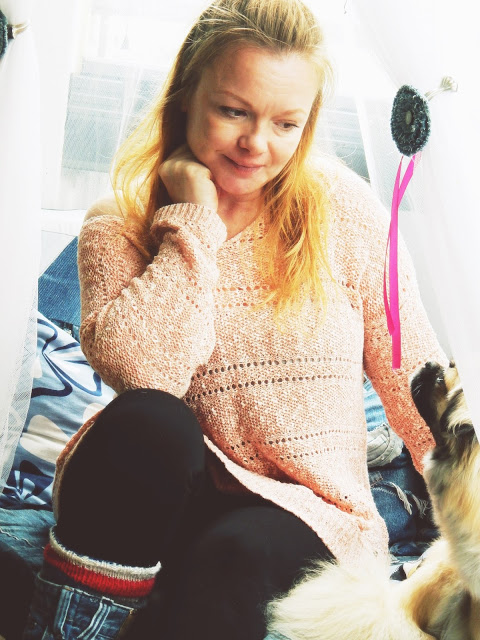 Täytyy kyllä todeta, että Kierrätyskeskuksen ilmaisosasto on ollut mahtava paikka kaikin puolin, aina löytää jotakin kivaa ja joukossa on aina jotain mitä ei edes lähde tuunailemaan mitenkään. Nytkin löytyi kuvissa näkyvä lohenpunainen minulle liian suuri neule. Tykkään näistä jättimäisistä neuleista paljon. Neule on siitä ihana, että se on kuin suoraan kasariluvulta roikkuu päällä ja eikä kutita mistään. Voin laittaa sen päälle myös töihin. Vaikka nyt on toimittanut vain kotipaidan virkaa. En ole tehnyt kirppiksiltä vain vaatelöytöjä vaan myös kenkälöytöjä. Kuvissa ainoastaan Puman kengät on ostettu, korkkarit ovat ilmaisosastolta. Puman tossut maksoivat 3€ ja olivat käyttämättömät. Tuollaisia minulla ei vielä ole kaapissa, joten pakkohan niille oli antaa uusi koti.