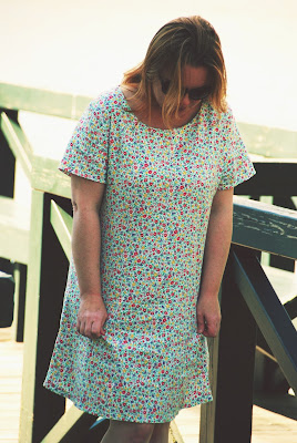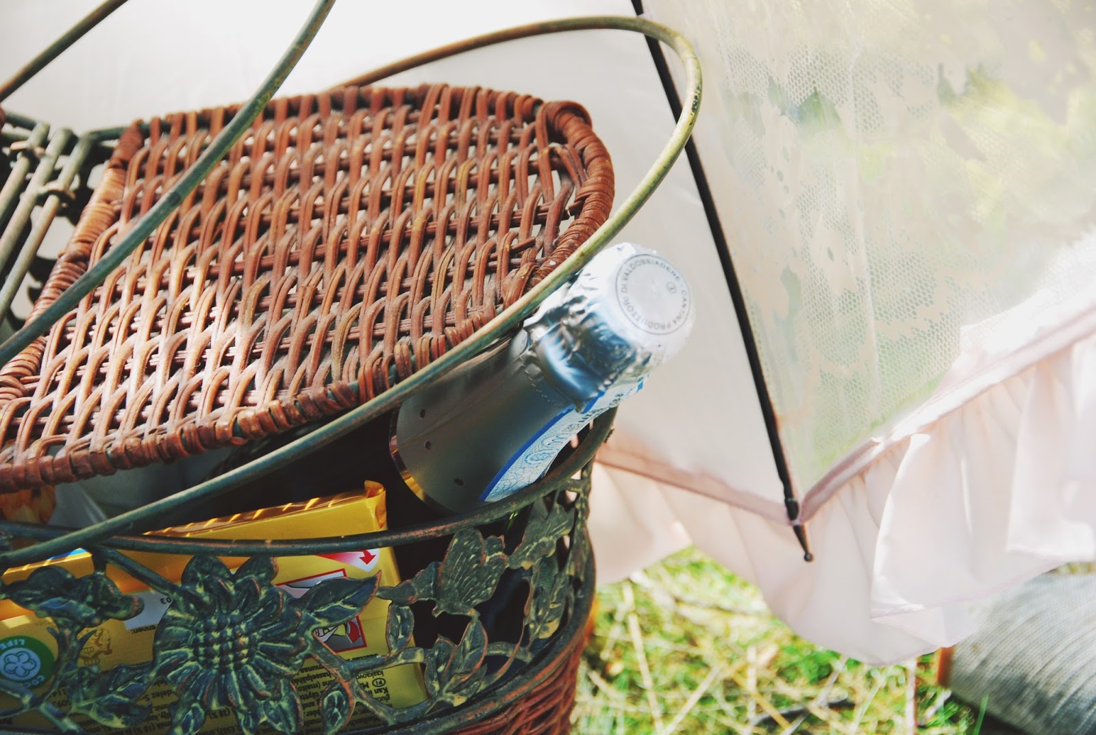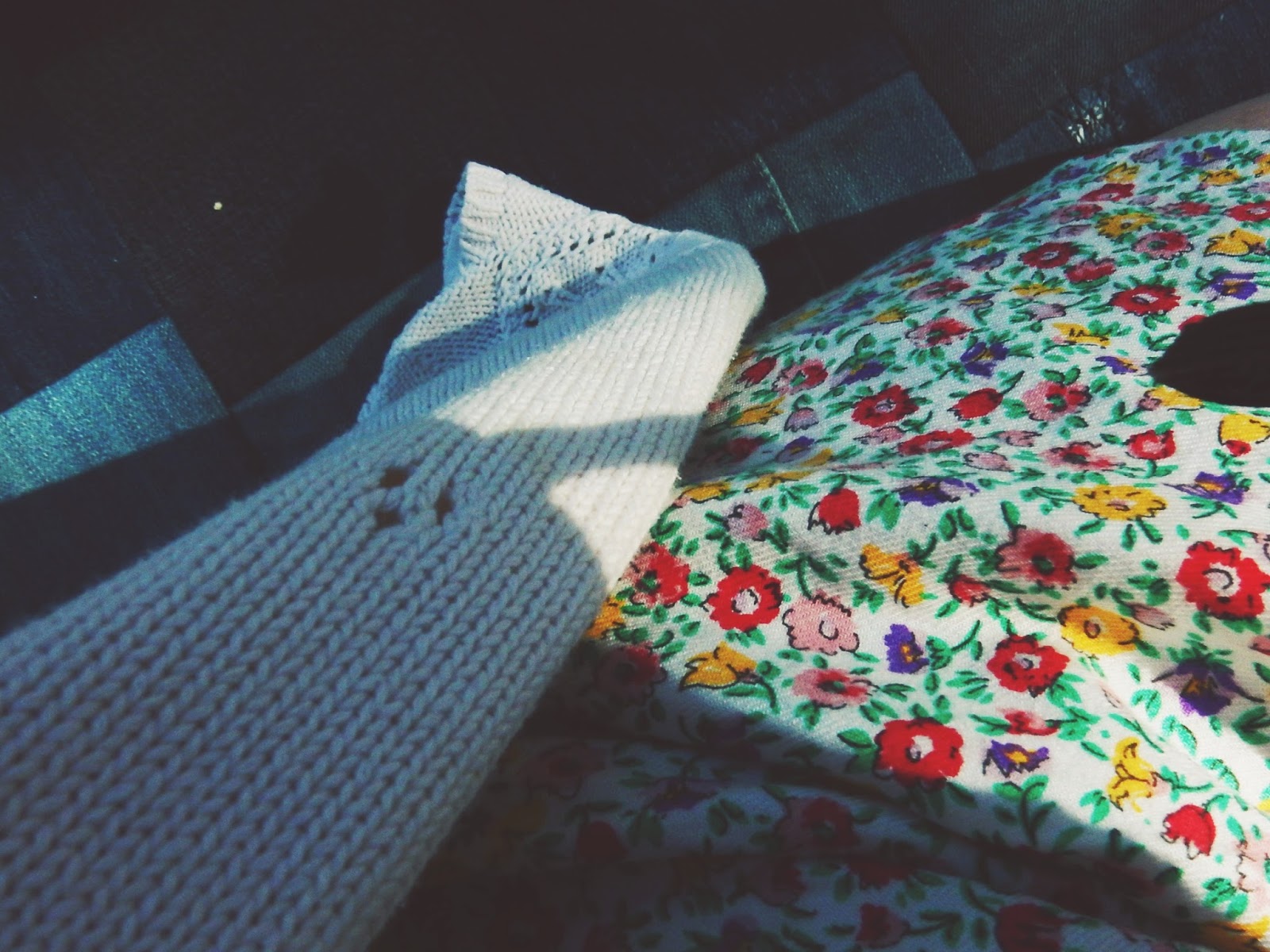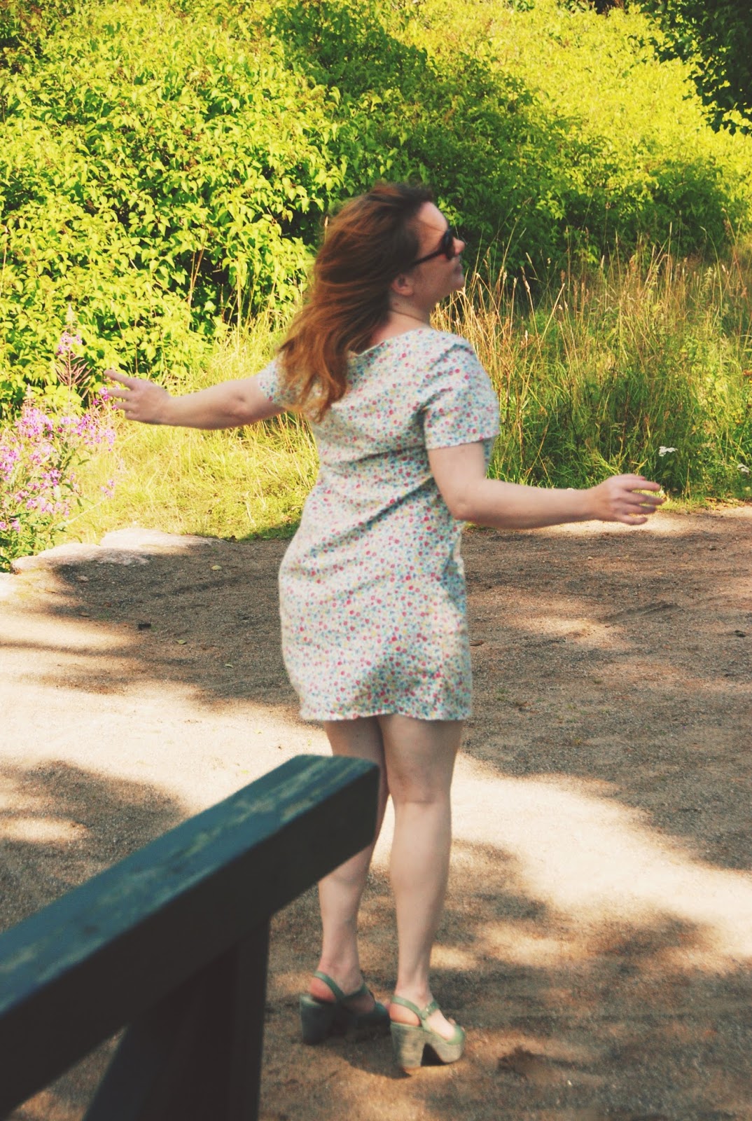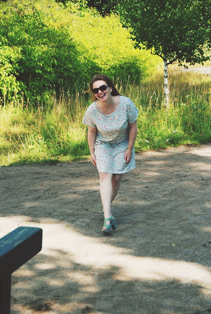 Piknikille puin ihanan kesämekon, jonka ostin kesällä Kierrätyskeskuksesta. Hienoa tässä mekossa rentouden lisäksi on se, että se on itse tehty. Samalla reissulla ostin myös jalassani olevat ihanat sandaalit. Ovat muuten mahtavat jalassa. Neuletakkini on tuttu täältä jo aikaisemmin.