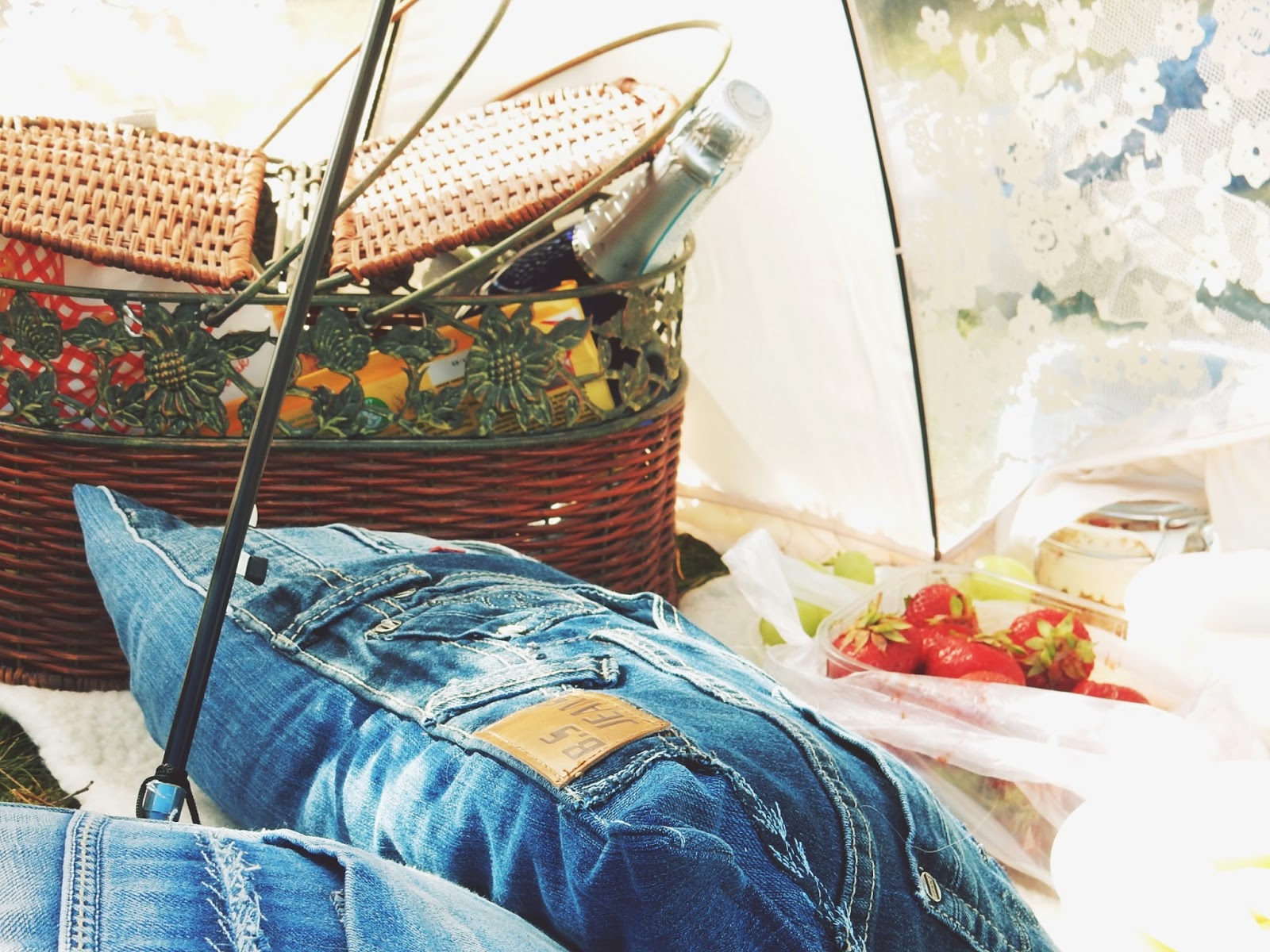 Eilen oli aika ihana ilma, vaikka tuulikin lujaa. Siitä huolimatta lähdettiin miehen kanssa pienelle lounas piknikille. Olen aikaisemmin löytänyt valmiiksi leikattuja farkkutilkkuja, joista tein jo kassin mutta paloja jäi siitä työstä sen verran paljon, että ompelin niistä myös piknik alustan. Ja tyynyjä lisää vanhalla tekniikalla, jota mielelläni käytän.