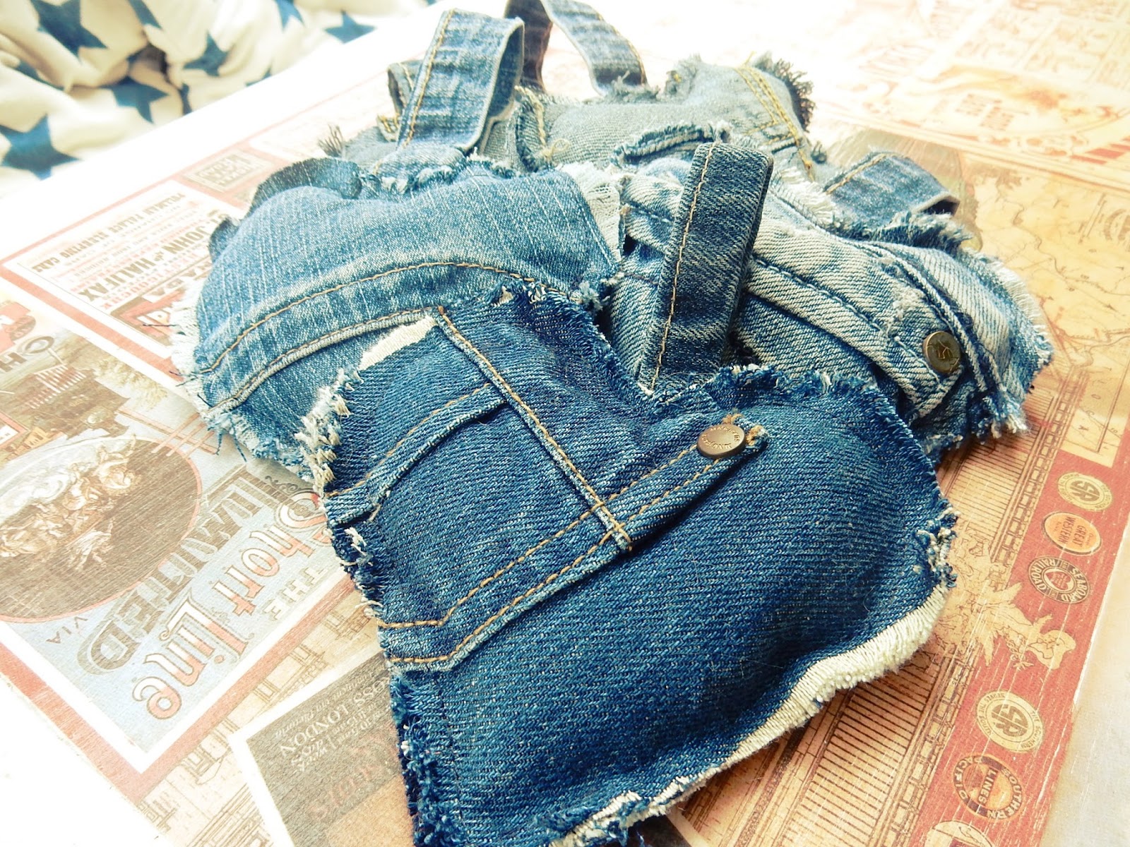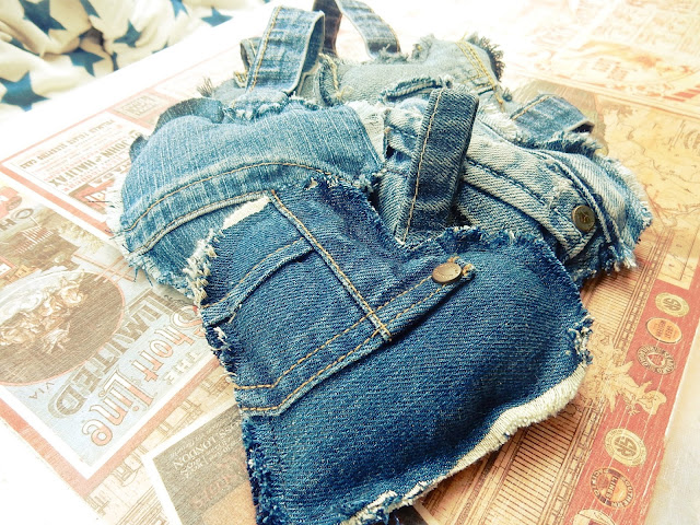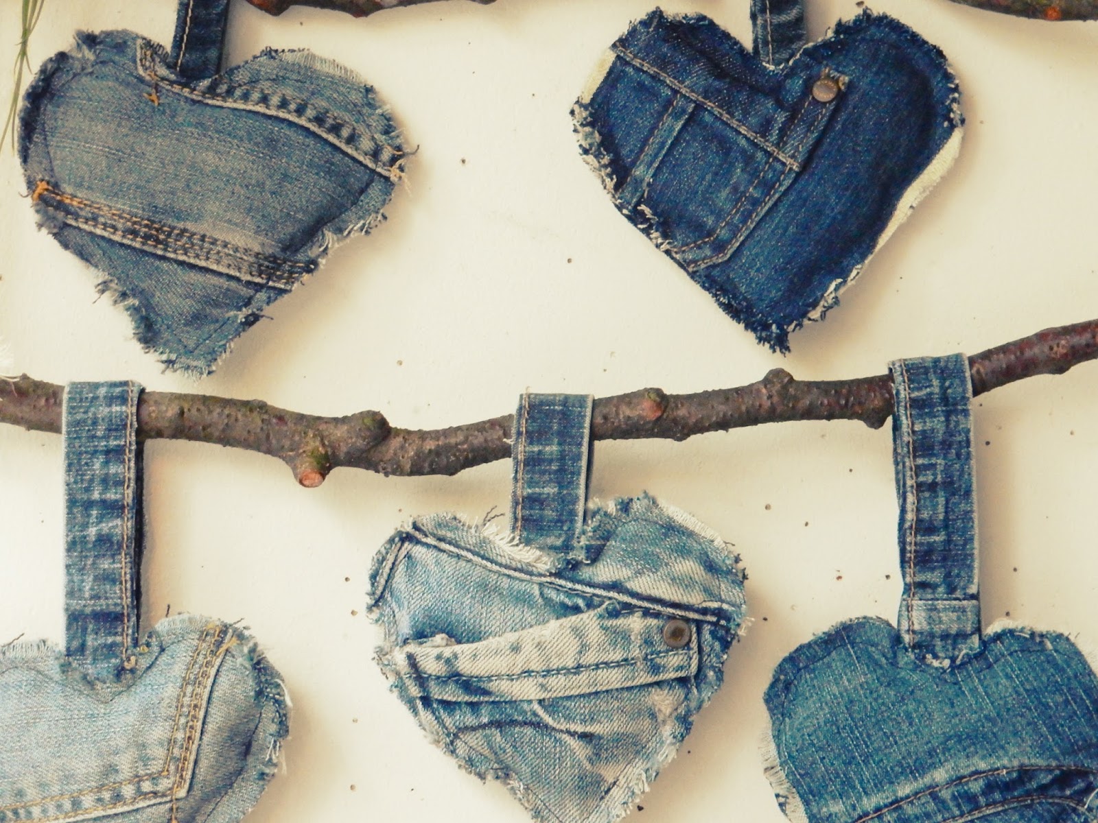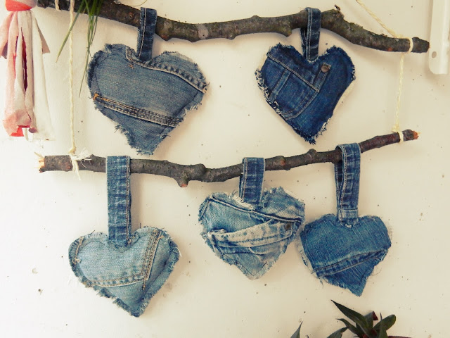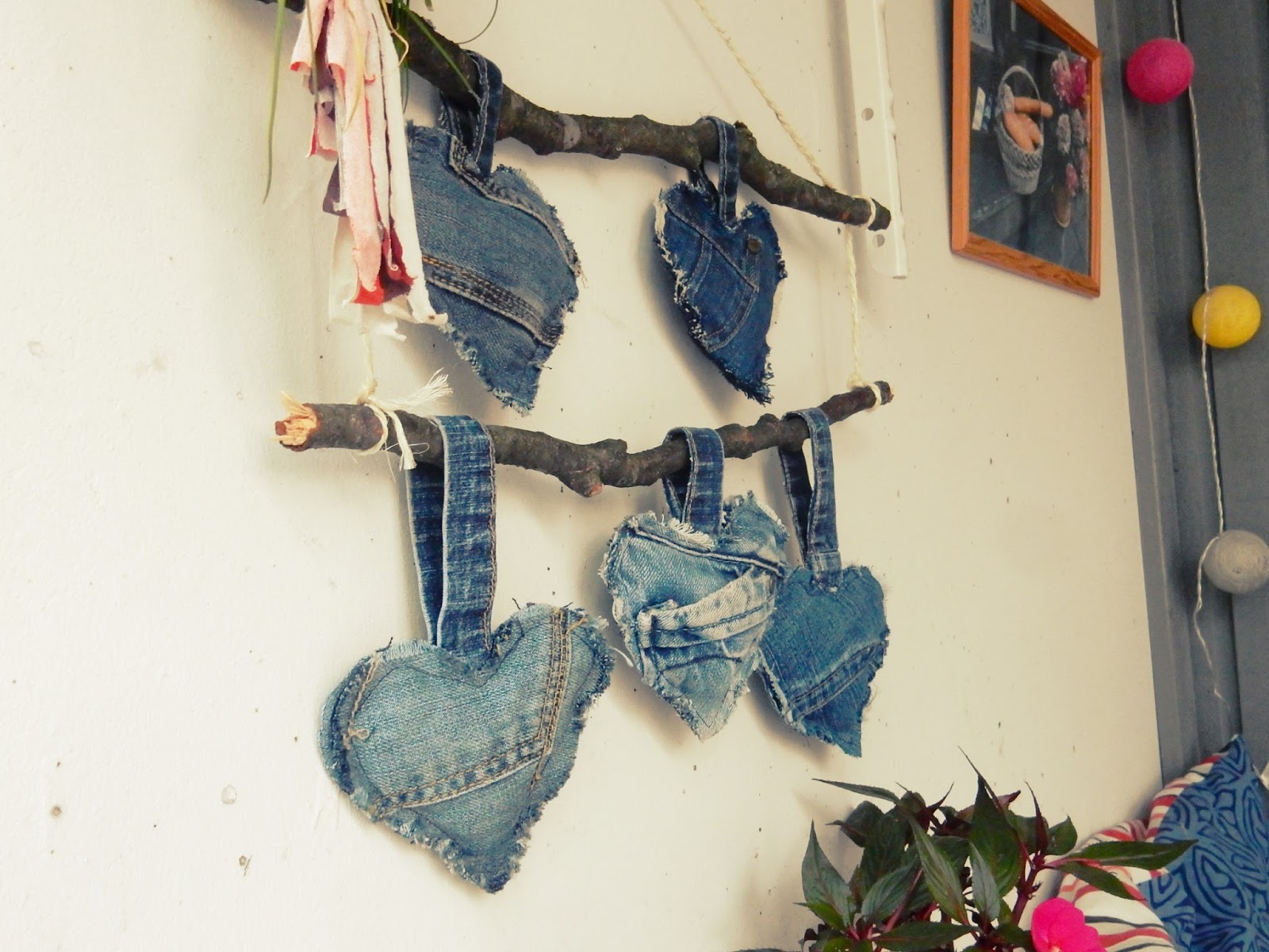 Tein farkku palasista sydämiä ja täytin ne omplujätteellä, pujotin sydämet kahteen lyhyeen oksaan ja sidoin toisiinsa kiinni narulla. Ja seinään roikkumaan. Näin tuli hauska seinäkoriste. Erittäin helppo toteuttaa vaikka ihan kirjavasta puuvillasta.