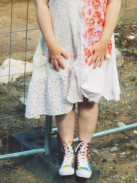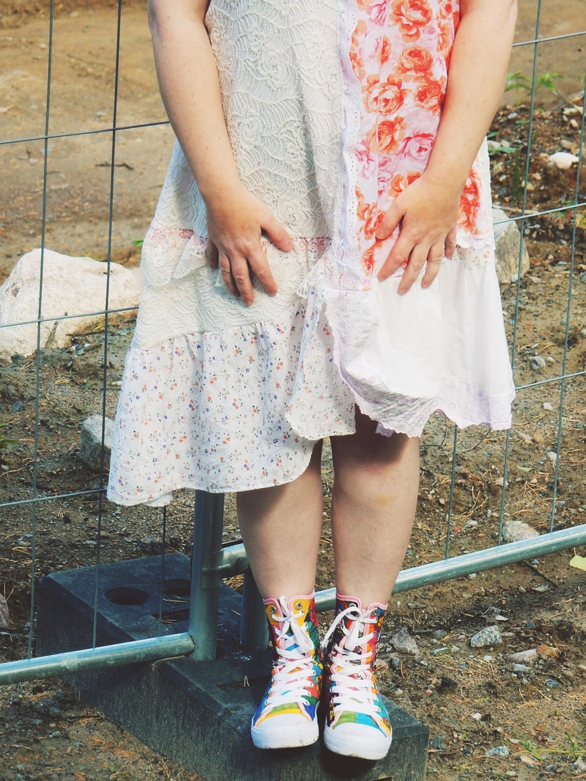 Esittelen siis viimeisen kesäasuni, joka on toteutettu vanhoista pitsimekoista, frillamekoista ja muista jämistä mitä on sattunut läjä projektin tiimoilta löytymään. Mekosta puuttuu vielä alushame, joka valmistuu ehkä ensi kesäksi. Mekko on A-linjainen ja helppo toteuttaa ilman kaavaakin omaa toppia apuna käyttäen. Muistaa vain jälleen lisäillä saumanvaroja reilusti…Helpompi ottaa pois kuin laittaa lisää. Anna mielikuvituksen lentää. Itse tykkään kovasti tästä ajatuksesta ja toteutuksesta. Eri materiaaleja kun käyttää, niin mekosta tulee erilainen.