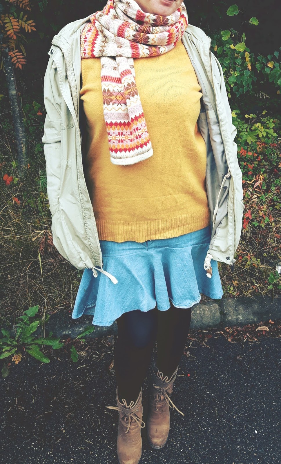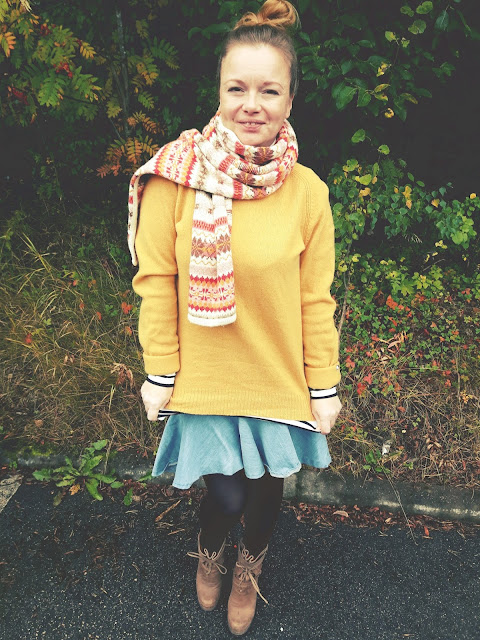 Fidan Outletista löysin kuvassa olevan kaulahuivin, ihanan pehmeää materiaalia ja tosi lämpöinen. Tällainen vilukissa tykkää todella paljon tuosta kaulaliinasta. Värit on jännät, sinapinkeltaista, valkoista, vaaleanpunaista, liilaa ja punaista mutta silti niin ihanasti yhdessä. Nappasin mukaani myös miesten Tommy Hilfigerin perus neuleen, joka myös on ihanan pehmeää materiaalia. Neule on iso mutta se ei haittaa ollenkaan, sillä minähän tykkään liian isoista vaatteista muutoinkin. Beige takki on työkaverilta saatu, tarkoitus on tehdä siitä jotakin mutta vielä en tiedä mitä. Nilkkurit on ostettu keväällä Fidasta Maunulan myymälästä. Kenkien pohjan leimassa lukee Wild West Vintage America Collection.