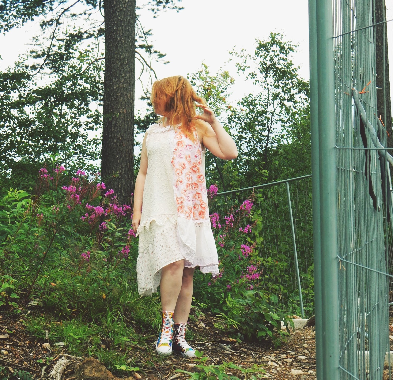 Esittelen siis viimeisen kesäasuni, joka on toteutettu vanhoista pitsimekoista, frillamekoista ja muista jämistä mitä on sattunut läjä projektin tiimoilta löytymään. Mekosta puuttuu vielä alushame, joka valmistuu ehkä ensi kesäksi. Mekko on A-linjainen ja helppo toteuttaa ilman kaavaakin omaa toppia apuna käyttäen. Muistaa vain jälleen lisäillä saumanvaroja reilusti…Helpompi ottaa pois kuin laittaa lisää. Anna mielikuvituksen lentää. Itse tykkään kovasti tästä ajatuksesta ja toteutuksesta. Eri materiaaleja kun käyttää, niin mekosta tulee erilainen.