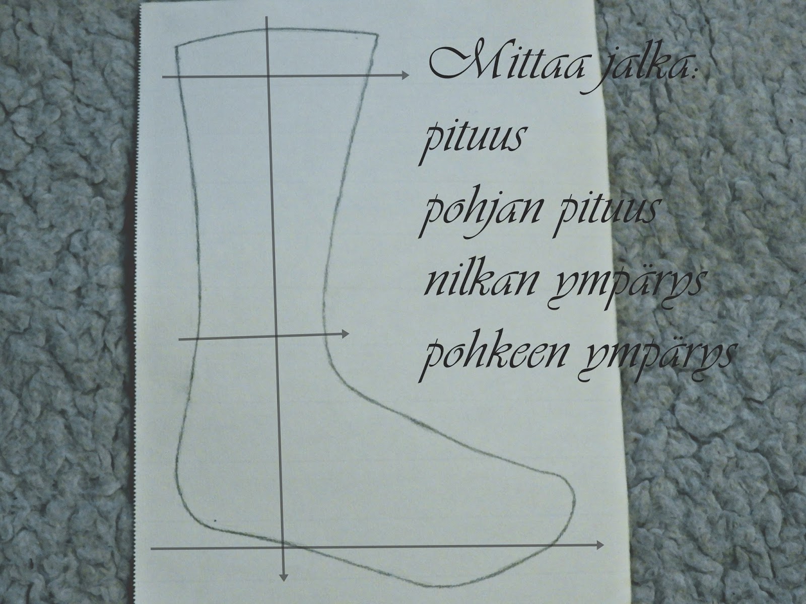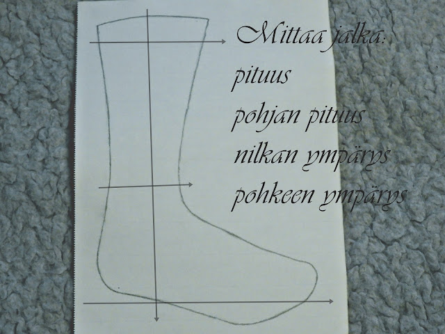 * Mittaa ensin jalanpohjan pituus, sukan pituus, nilkan sekä pohkeen ympärys. Ota mitoista pois noin 1cm. Puolita pohkeen sekä nilkan ympärys ja saat näin sukan etu -ja takaosan kaavan. Muokkaa takaosankaavaa sen verran, että siihen saat kantapään kohdan. Piirrä sen jälkeen pohjakappale, jonka kantapääosa on samanlainen kuin varren takaosan kantapääosa.