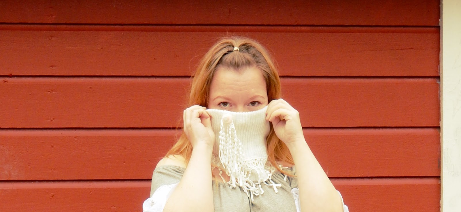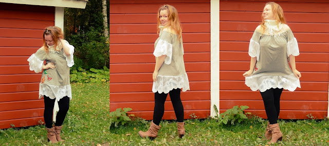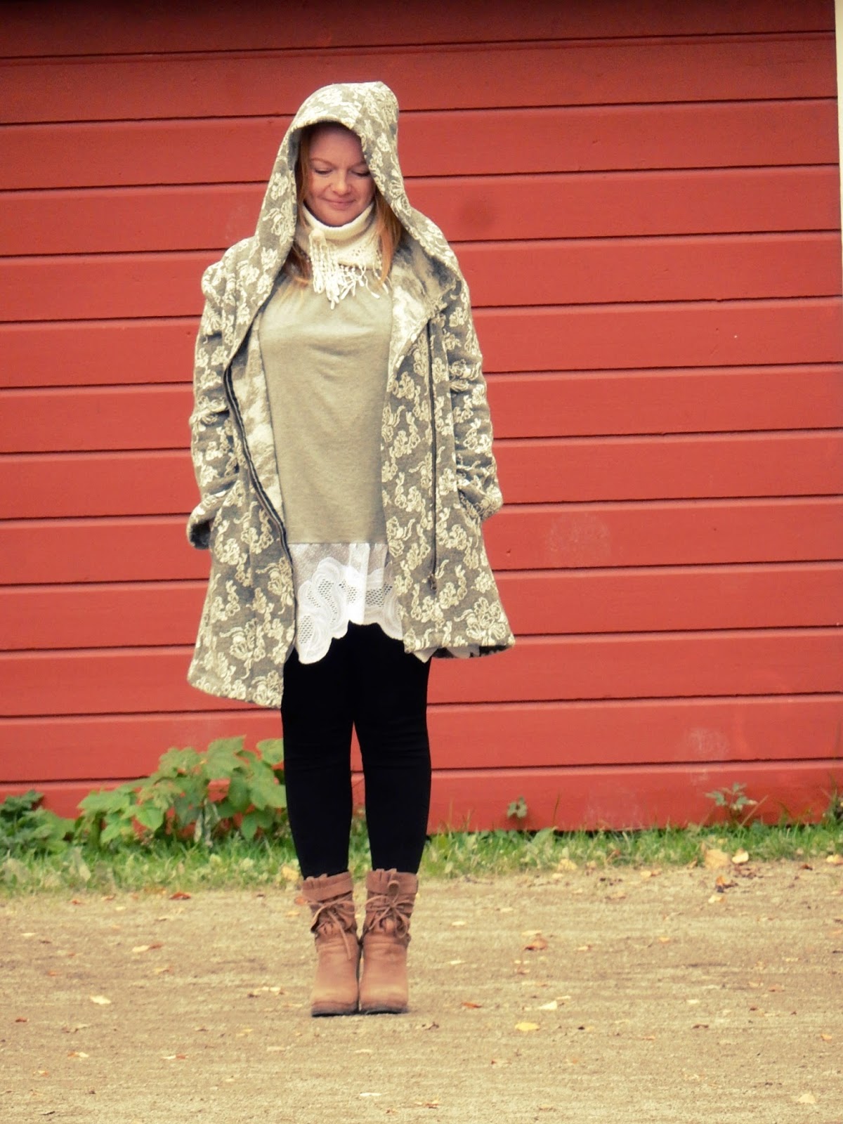 Tuossa kesän loppupuolella innostuin jälleen off the shoulder -vaatteista ja pakkohan oli omella ihan ensimmäisenä vanhasta t-paidasta sekä pitsiverhosta uuden uutukainen tunika. Halusin mahdollisimman oversize -tunikan, sillä pidän erittäin paljon vaatteista, jotka ovat rentoja, eivätkä kiristä yhtään mistään. Lumppulaatikosta onneksi löytyi yksi isokokoinen t-paita ja ei muuta kuin tekemään. Lopputulos on juuri sellainen kuin olin suunnitellutkin. Helmassa olisi saanut olla ehkä vähän enemmän volyymia mutta materiaali oli rajallinen, joten ei auta muu kuin olla tyytyväinen tähän. Asuun puin myös tuubihuivin, jonka olen tehnyt neulepaidan kauluksesta, joka jäi yli toisesta tuunauksesta. Hauska idea ja sopii minulle oikein hyvin ja voi yhdistää melkein minkä tahansa vaatteen kanssa. Antaa hiukan boheemin ilmeen asuun. Lopuksi kietouduin lämpimään ja pehmeään neuletakkiin, jonka olen oikeasti ommellut jo vuosia sitten. Noin viisi vuotta sitten. Kankaan nurjapuoli on harjattu ja on ihanan pehmeä ja lämmin. Olen käyttänyt takkia hyvin vähän, sillä en koe sen olevan yhtään tyyliäni. Ehkä voisi lisätä pitsejä vähän sinne tänne, jos se sitten olisi enemmän minua. Katsotaan miten käy takin.