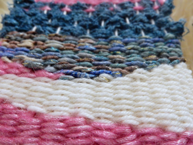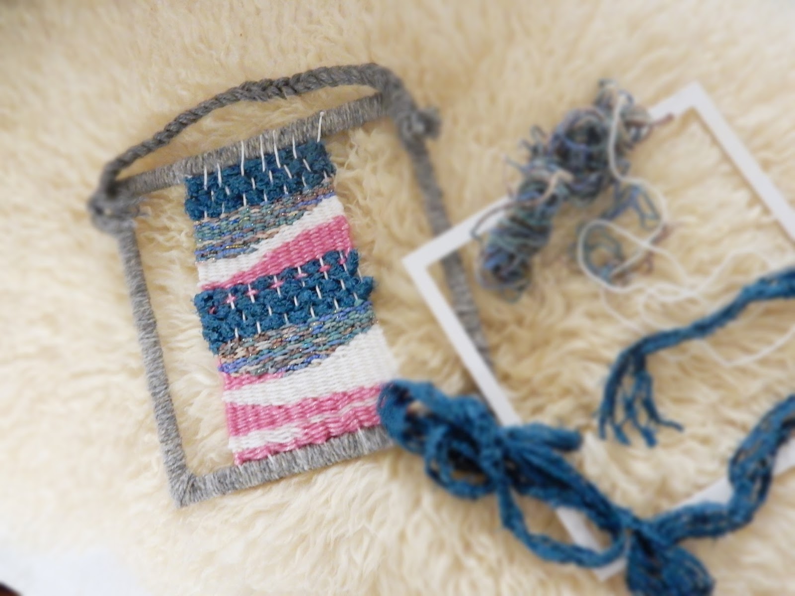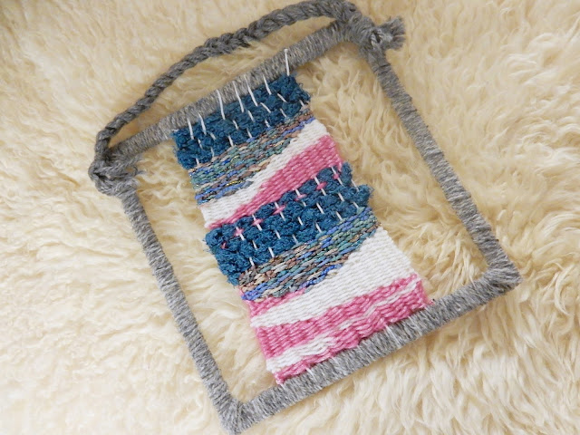 Ensin laitoin puuvillalankaa kehikon ympärille ja aloin punoa eri langoilla kuvioita puuvillalankojen läpi. Kun kuviot oli valmiit kierritin harmaata villalankaa kehikon ympäri ja ompelin lettijämän lopuksi kehikkoon kiinni. Hauska, hiukan talvisen fiiliksen tuova ovikoriste. Tämä homma on kyllä sellaista mitä voisi tuolla töissäkin tehdä lasten kanssa.