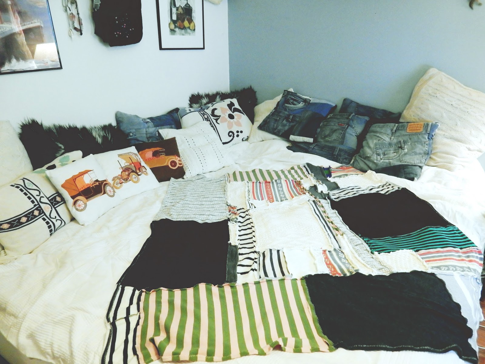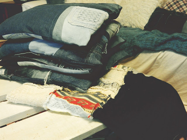 Loppu leikkuu-ja ompelujäte on helppo piiloittaa tyynyjen sisälle. Farkkutyynyt sopii meille hyvin ja uusi peitto tykkää kovasti näistä hauskoista tyynyistä. Jos ette ole vielä huomanneet, niin meikäläinen tykkää tyynyistä ja paljon. On ihana tehdä sängystä kunnon löhösohva, jossa voi nautiskella elämästään kirjaa lukien, leffoja katsoen tai neuloen tai tehdä kaikkia samaan aikaan. Varsikin talvella on ihana hautautua lämpimään peittojen ja tyynyjen joukkoon teekuppi kädessä. Jaa, että miksikö sänky on mun lempipaikka?
