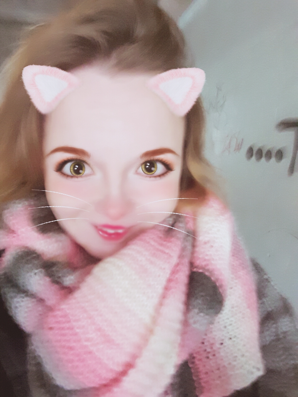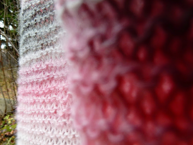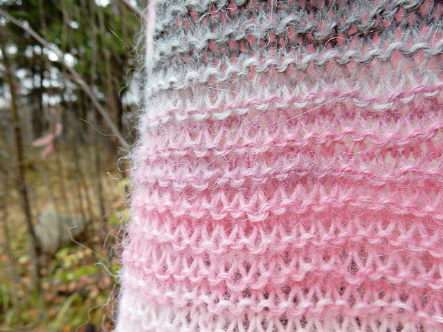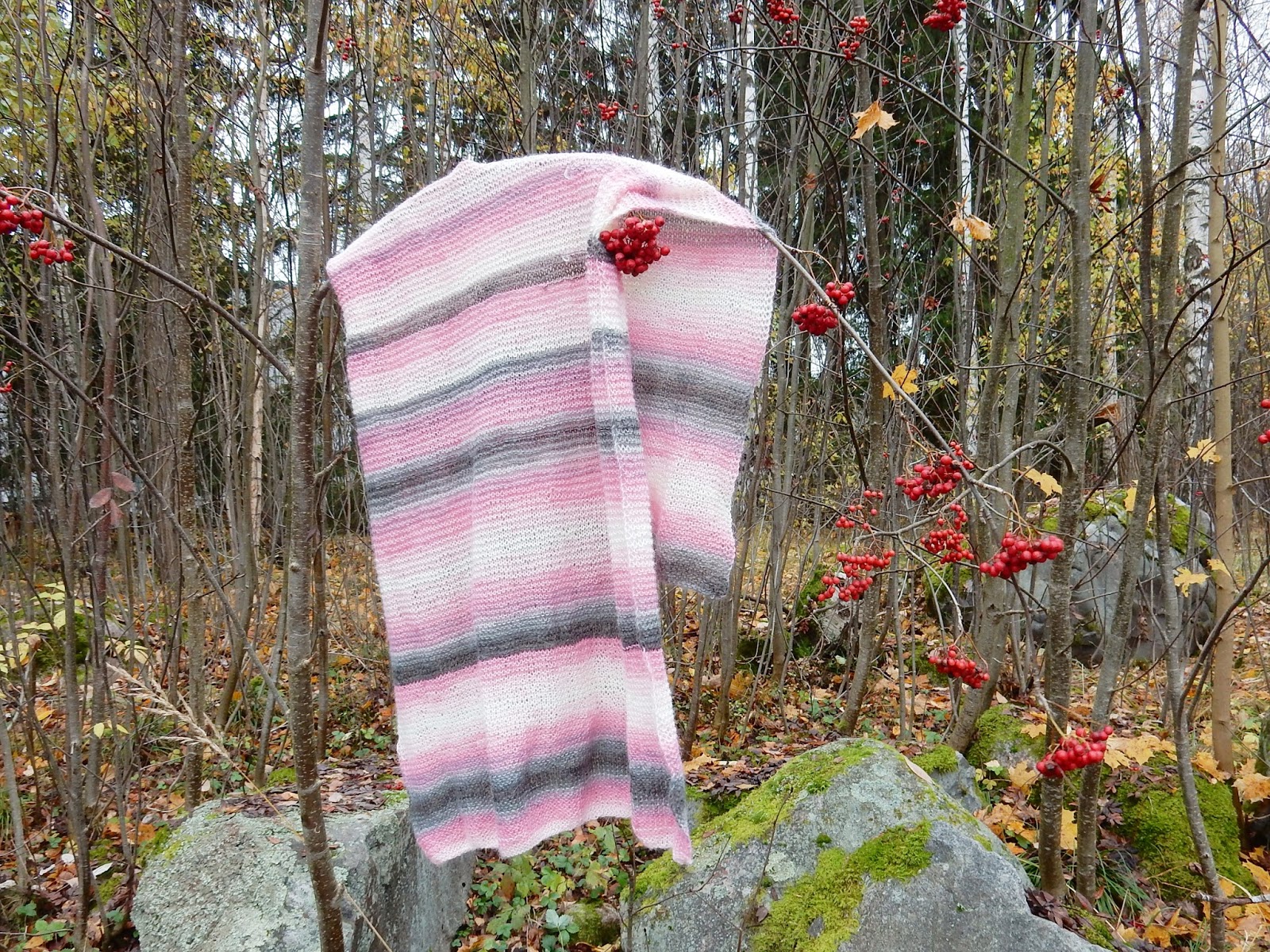Vaaleanpunainen/harmaa ei ole ollenkaan minun värini mutta siitä huolimatta tykkään todella paljon tästä värimaailmasta. Jotenkin rauhoittava ja koska tämä lanka on ihanan hattarainen tulee myös hieman romanttinen fiilis kun pukee huivin ympärilleen. Tämä myös on super lämmin ja näinkin vilukissa kuin minä pysyn hyvin lämpimänä.