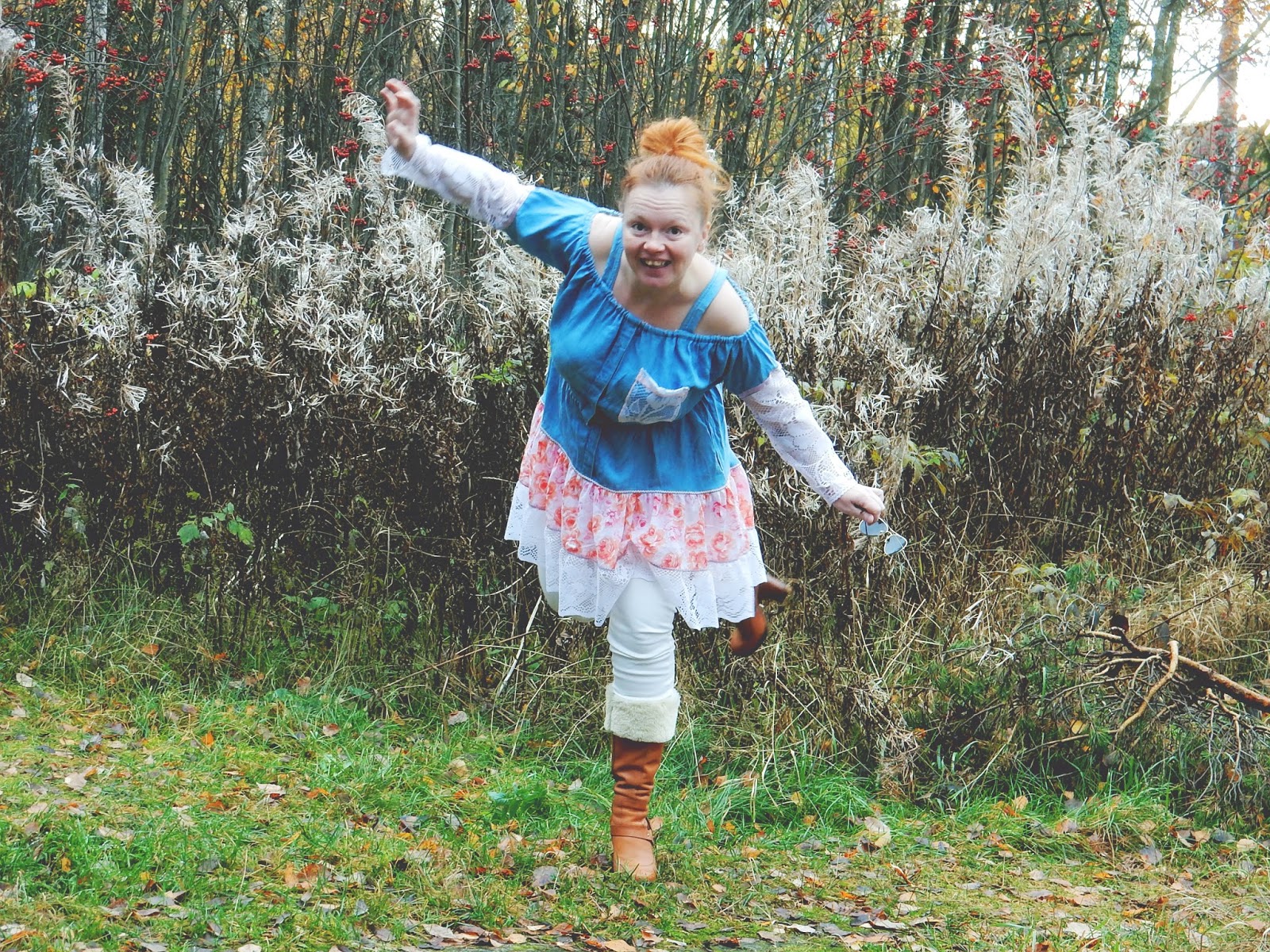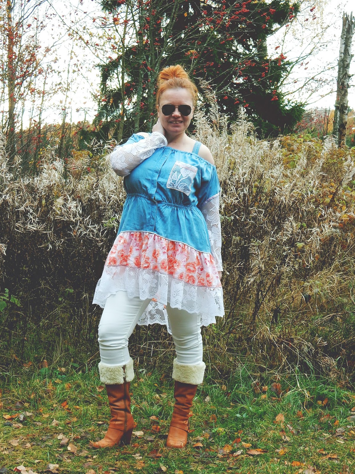 Tällä hetkellä on hiukan sellainen olo, että jätän tuon läjä projektin unholaan ja keskityn muihin töihin. Tavallaan sekin harmittaa, sillä silloin läjä taas kasvaa. Mutta tällä hetkellä ei tunnu tulevan minkäänlaista ahaa elämystä näistä materiaaleista, joita läjässä on. Teinkin niin, että syyslomalla laitoin isot kassit tilkkuja ja jämiä kouluun askarteluja varten. Samaa ajattelin tehdä myös meidän omaan kouluun. Eli saisin aika näppärästi tuosta kasasta nyt tavaraa pois toisella tavalla mitä olen ajatellut. Parin tuotoksen korjaaminen on myös edessä kun haluankin niistä vähän muuta mitä ne nyt on. Eli suunnitelmien muutoksia on tiedossa. Myös uuden blogi on avattu mutta siellä ei vielä toistaiseksi ole yhtään mitään. Koitan aloittaa sen mahdollisimman pian. Blogi pyörii edelleen näiden härpäkkeiden ympärillä mutta nyt on teilläkin mahdollisuus saada omaksi näitä omituisia ja erilaisia vaatteita. Tyyli muuttuu ja minä sen mukana.