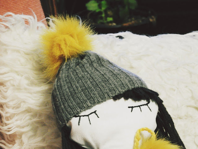 Tässä siivotessa, tein elämäni ensimmäisen nuken. Työpisteellä pyöri vanhat valkoiset farkut, vanha puuvillapaita ja neulepaidan palasia. Näistä tein nuken, itselleni kun nuket ei ole meillä se juttu ollenkaan koskaan ollut. Molla saa olla rauhassa olohuoneessa. Lämpimästi puettuna nauttia olostaan. Nukke onkin vallattoman suloinen ja saa lähteä minun mukaani ihan joka paikkaan tästä lähtien. Oli sitten millainen reissu tahansa tulossa.