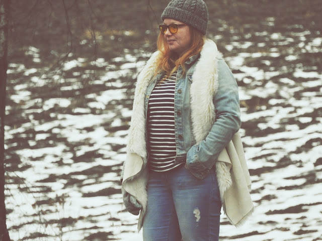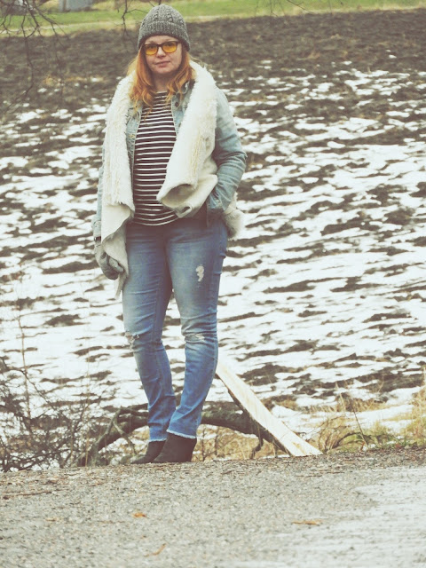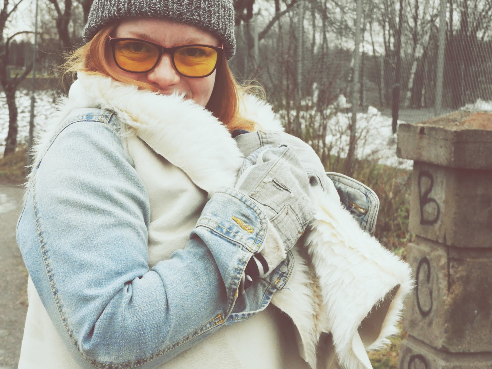 | Ilmaisosastolta: Kengät, paita sekä farkkutakki Itse tehty: Liivi, pipo ja rukkaset |