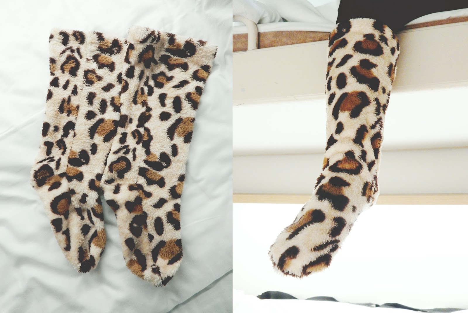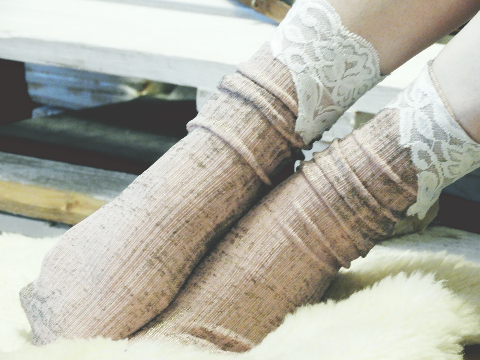 Kuvissa on kahta erilaista materiaalia, omat sukkani on glitterpintaista trikoota ja Härdellin sukat on tehty keinokarvasta. Keinokarva ei juurikaan veny, joten siihen kannattaa tehdä kaavat kyllä ihan jalan mittojen mukaan. Omat sukkani taas on niin venyvää, että jouduin niitä pienentämään sovituksen jälkeen.