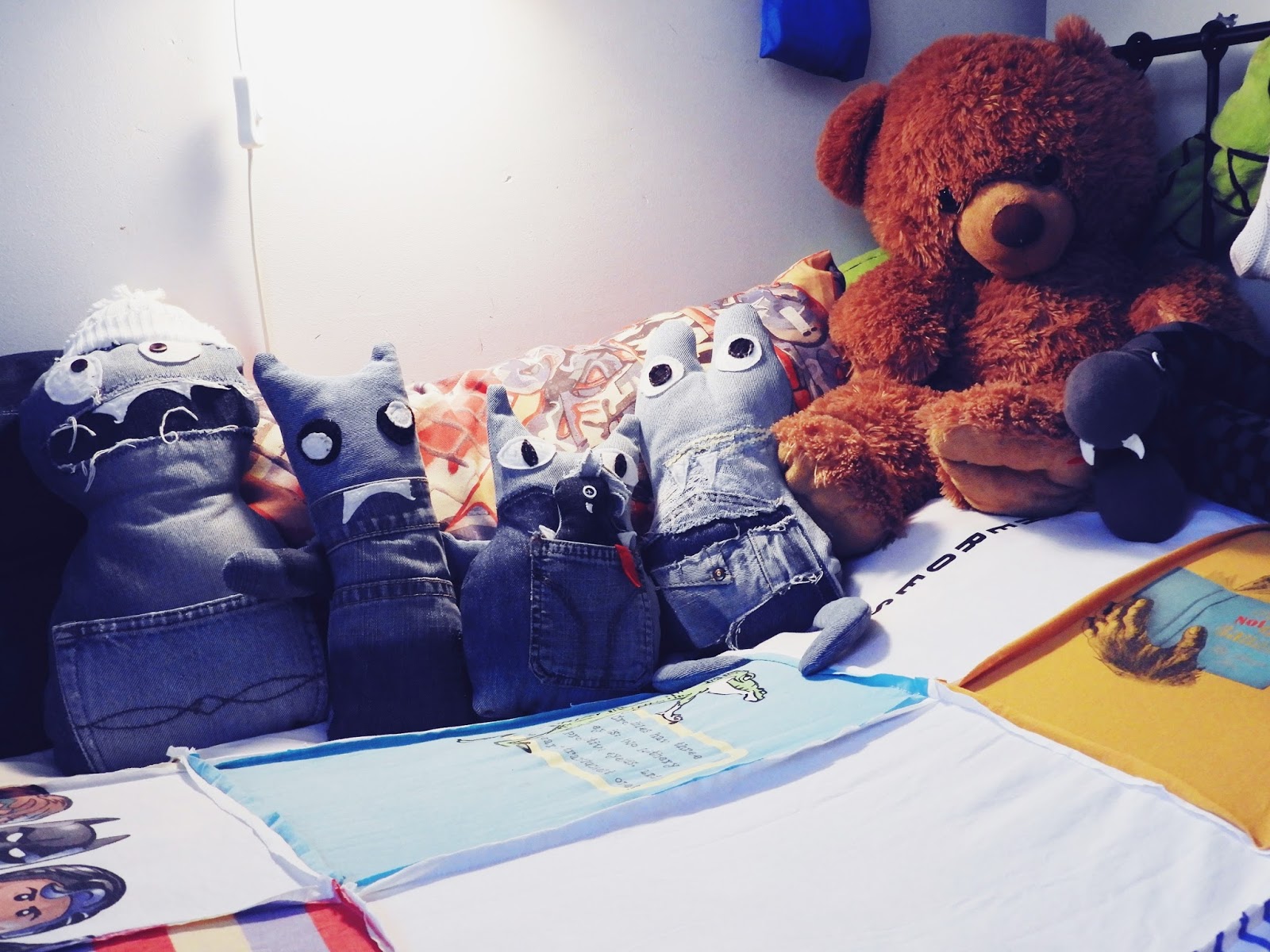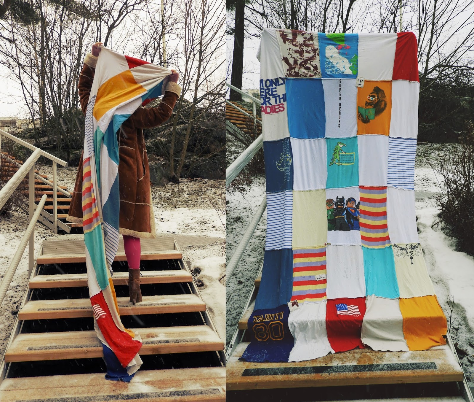 Tässä siivouksen lomassa löytyy paljon myös sellaista vaatetta, jota ei voi laittaa kierrätykseen. Tällaisia löytyi esimerkiksi pojan t-paitalaatikosta. Paidat ovat olleet tosi rakkaita ja siksi päätinkin tehdä hänelle niistä päiväpeiton mieluummin kuin tehdä pesurättejä. Päiväpeiton voi toki tukea mutta tämän tarkoitus on se, että kun joukossa on monta todella ohueksi kulunutta paitaa niin saan helposti ommeltua niihin erilaisia paikkoja, joita olen leikellyt samaisista paidoista. Päiväpeiton tarkoitus on siis muuttua sen mukaan miten menee rikki. erilaisin tekniikoin korjaillaan yms. Tämä oli pojan toive. Näin myös paidat kestää käytössä pidempään kun niistä tulee jotakin ihan muuta.