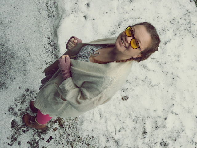 Asuni on lähes kokonaan Kierrätyskeskuksesta haalittu. Käytän kesämekkoja paljon myös talvella paksujen sukkahousujen ja villasukkien tai saapikkaiden kanssa. Lämmin neule sopii asuun myös hyvin. Kuviin pääsi myös minun kaikkein ihanin kelsiturkkikin.
