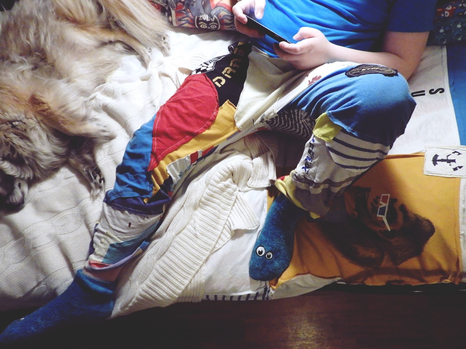 Tuossa jokin aika sitten esittelin täällä päiväpeiton, jonka tein Härdellin vanhoista t-paidoista. Paidoista jäi osia ja palasia yli, kuten hihoja. Myös leikattuja tilkkuja jäi yli. Näistä tein kankaan yhdistelemällä osia toisiinsa. Pyjamapöksyistä tuli hauskat ja poika tykästyi niinhin täysin. Ei muita pylamapöksyjä eneää käyttäisikään.