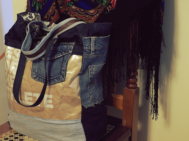 Kirppisostoskassi paperikassista ja farkkujen palasista