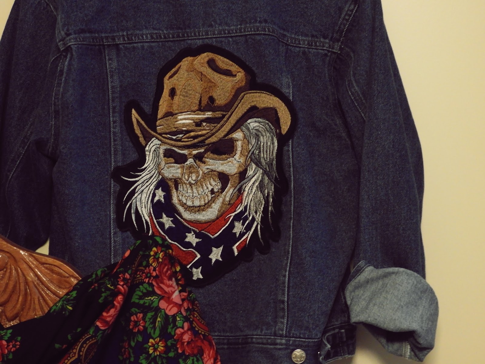 Farkkutakki oli ihan perus takki, sellainen mihin olemme me 70-luvun lapset tottuneet, erittäin laadukas materiaali, paksu ja leveä. Kaikkein helpoin tapa tuunata vanha vaate on kiinnittää siihen merkkejä. Nykyään ei tarvitse edes ommella niitä kun niissä on liimapinta. Tarvitaan vain silitysrauta, jolla kiinnittää merkin kiinni. Itse valitsin ison kuvan, joita olen ostanut kauan sitten Karnaluksista, silloin kun en vielä kierrätyshommista perustanut juurikaan. Näitä isoja tuli sitten kiinniteltyä juurikin farkkutakkeihin kuten tähän. Tällaisia isoja kuvia on erilaisia, ei vain näitä tällaisia. On kukkia ja lintuja yms. Ja voi kiinnittää lähes mihin tahansa. Kannattaa hyödyntää näitä. Ovat kivoja.