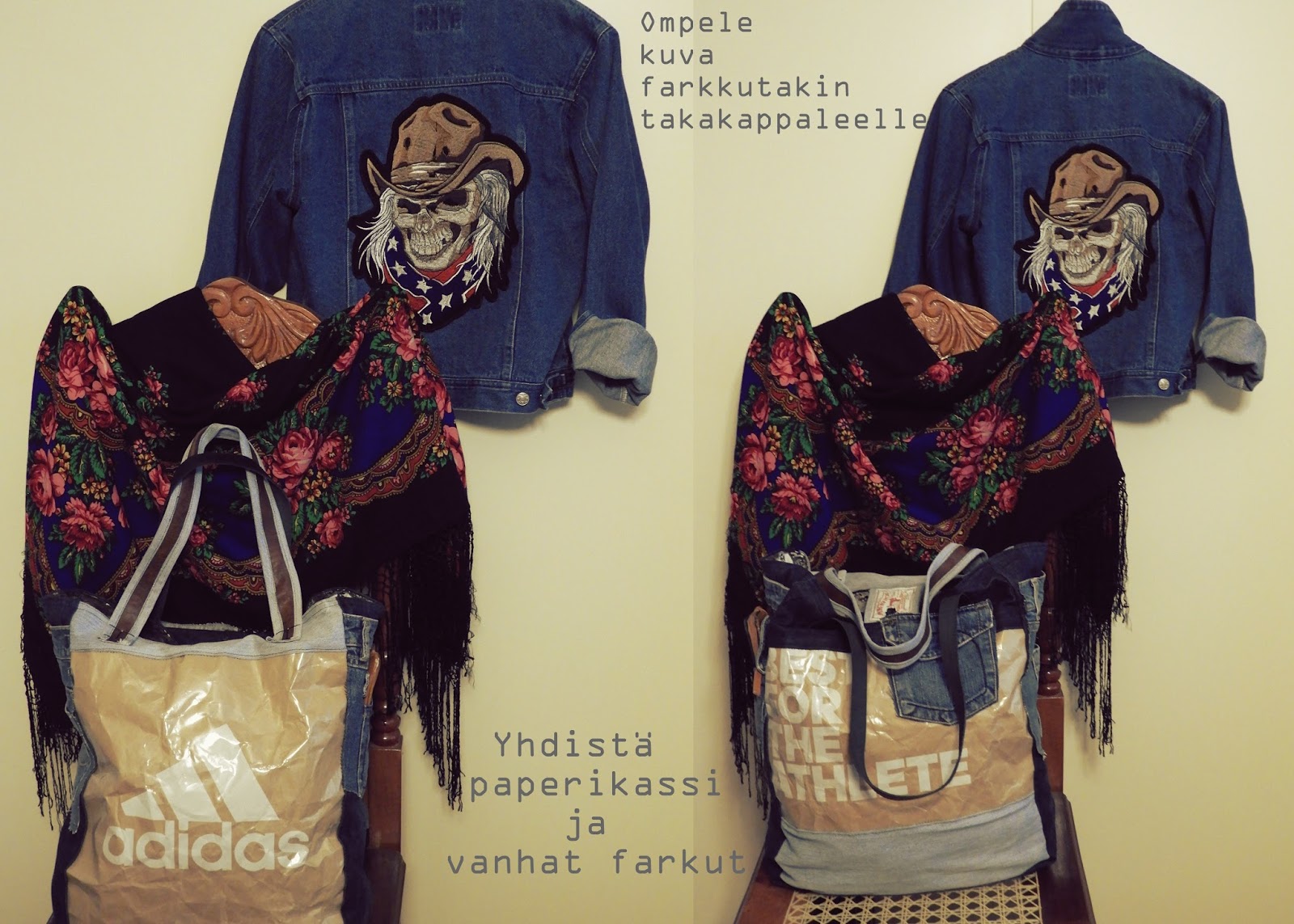 Kierrätyskeskuksen uuden myymälän avajaisten kunniaksi tein kolme postausta aiheesta ja nyt on sen viimeisen postauksen vuoro. Nimittäin, tuunasin lopulta kuitenkin löytämäni farkkutakin ja niin helposti ja yksinkertaisesti, että kuka vaan osaa tehdä tämän. Koska postaus olisi aika tylsä, jos laittaisin vain muutaman kuvan tuosta ihanasta takista niin postaukseen pomppaa myös Lumppis-projektin uusin tulokas, nimittäin kirppisostoskassi.
