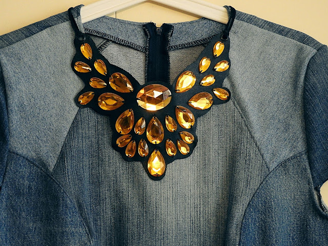 Tuo peplum on tehty vanhoista farkuista ja koru vanhoista sambakoruista ja nahkatakista.