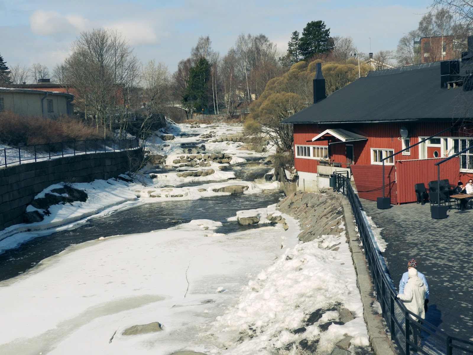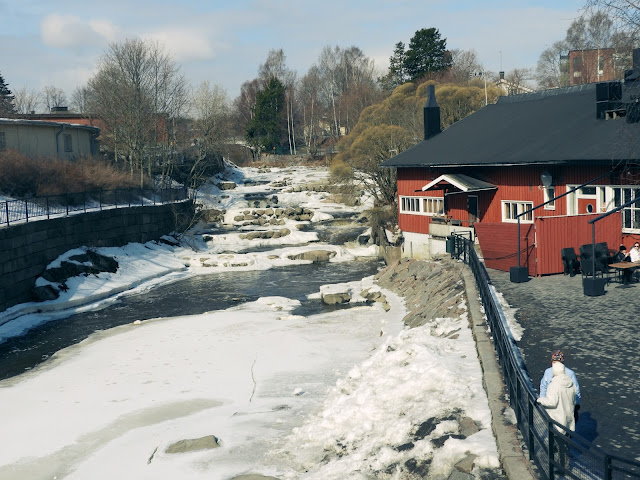 Lähdettiin siis ulkoilemaan vanhaan kaupunkiin. Siellä on aika kivaa nähtävää. Viima oli tosin kova kun siellä pyörittiin ja olikin hyvä, että otin kelsitakin mukaani, en olisi pärjännyt ilman sitä. Vesi on minulle todella tärkeä elementti ja vähintään joki tarvitaan rauhoittamaan mekäläistä. Meri antaakin sitten suuren tujauksen voimaa mutta tietenkin meri oli aika jäässä, joten virtaava joki osottautui tällä kertaa tärkeäksi minulle. Koskenrannan terassilla oli ihmisiä nauttimassa auringosta ja muutenkin vanhakaupunki oli hyvin elävä sunnuntaina. Monet olivat lähteneet moikkaamaan ihanaa aurinkoa. Reissussa voimaantui hyvin ja jaksoi vielä maanantain hoitaa sairaita kuntoon.
