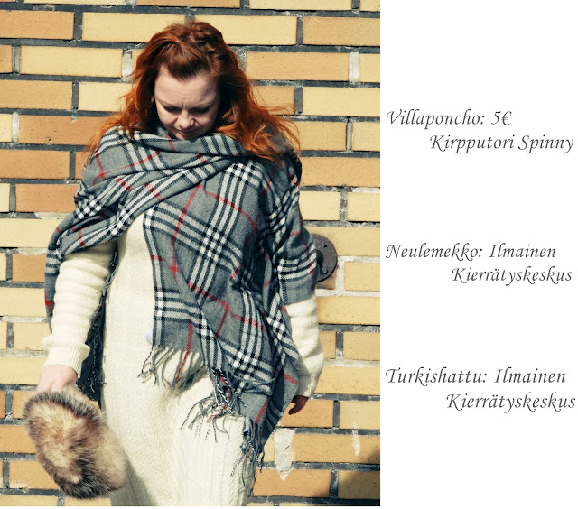 Vaikka meidän ulkoilu ei ollut tuntia pidempää niin halusin muutenkin saada sitä kipeän ihmisen oloa pois pukemalla jotakin kivaa päälleni. Asu koostui kirppis vaatteista, omista 2006 ostetuista talvisaapikkaista ja tietenkin kun merenrannalla tuulee kovasti, niin tuunattu kelsiturkkini oli mukana myös. Tyylin ei tarvitse maksaa paljoa vaan voi valita myös halvemmat vaihtoehdot. Toki jos haluaa ilmaisosastolta löytää jotain, niin siihen tarvitaan aina onnea ja kunnon metsästysvainua. Nykyään en juurikaan käy kirppiksillä ja vielä vähemmän ilmaisosastolla mutta noin kerran kuussa tulee jotakin kivaa löydettyä. Lähinnä kuvausrekvisiittaa etsin nykyään.
