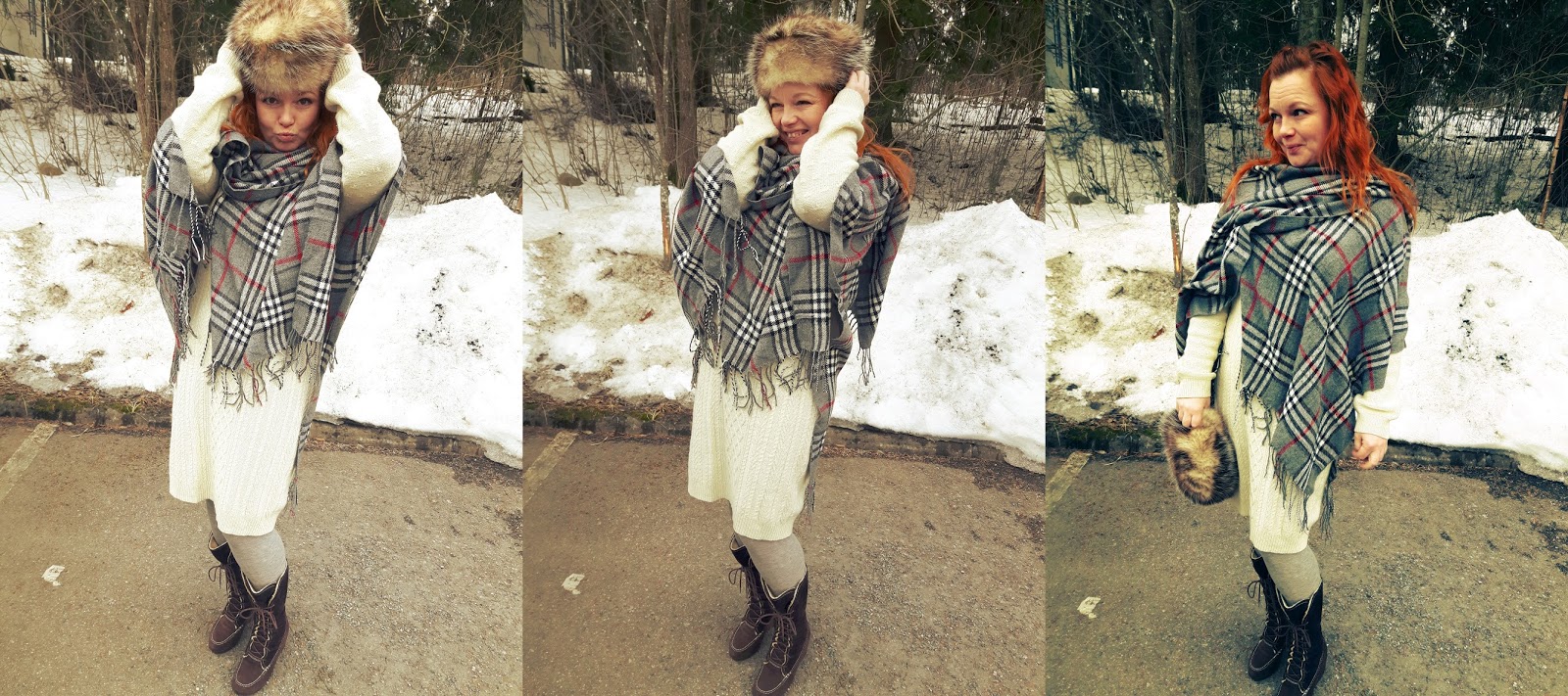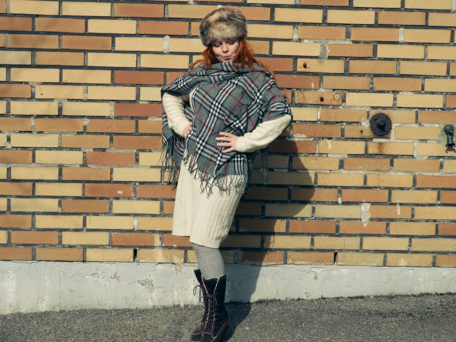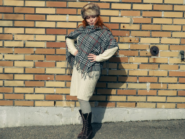 Tämä sunnuntain talvinen tyyli on helppo rakentaa yksinkertaisista vaatteista ja asu muuttuu sen mukaan mitä mekon päälle laittaa. Ponchon kanssa asu on chic ja takin kanssa taas tulee fiilis menneistä ajoista. Mekko sekä turkis onkin olleet täällä blogissa esillä ennenkin. Tai takin esittelin paremmin tässä postauksessa.