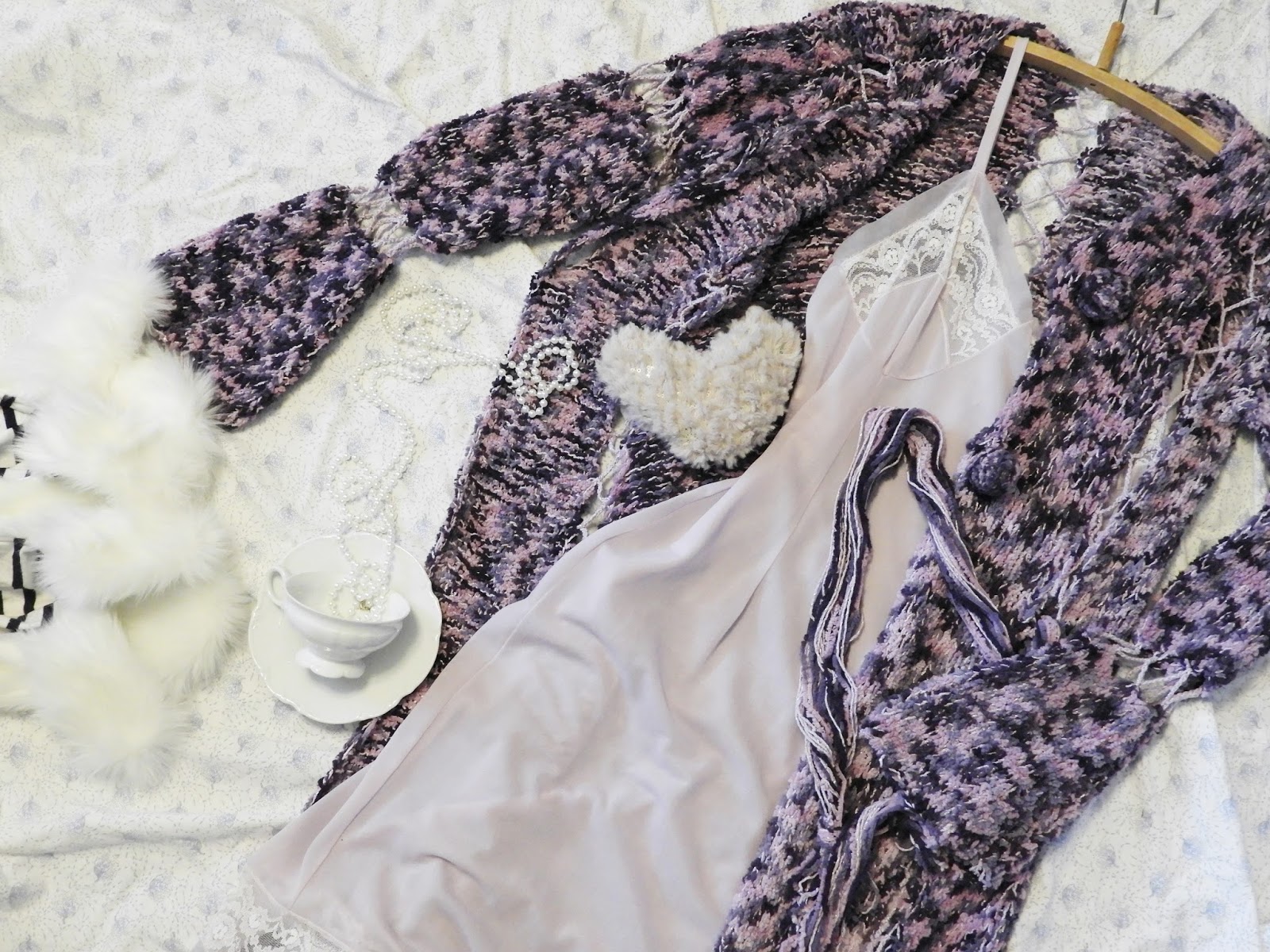 Kuvan ihanan pehmeä neuletakki on minulla aamutakin virassa. Alunperin neuloin sen ihan arkikäyttöön mutta ei ole enää yhtään tyyliäni, joten sopii hyvin aamutakiksi. Malli on aika vanha, oli Novitan lehdessä joskus 2000 -luvun alussa, lanka on todella pehmeää samettilankaa, josta silloin tehtiin paljon erilaisia neuleita. hitti juttu. jos muistat mistä lehdestä malli on niin kerro se kommettikenttään niin lisään sen postaukseen.