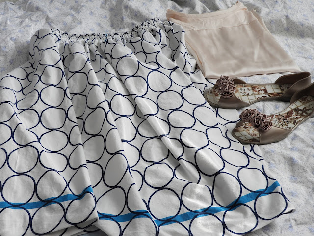 Lumppulaatikon perukoilta löytyi verho, jonka olen aikanaan napannut ilmaisosastolta, jo silloin näin, että verhosta tulee joko hame tai mekko minulle. Kun aloin sitä käännellä ja väännellä niin oli aika selvää, että verho on hame, ihana ilmava hame. Kun tuolloin käytiin Nihtisillassa, oli oloni nuhjuinen, ärsyyntynyt ja olin todella kettuuntunut kaikkeen, sairauteni temppuili ja tuntui kuin olisin ollut 100 vuotias mummeli. Tällä reissulla kuitenkin nuorruin sen 50 vuotta ja ilmaisosastolta lähti muutama ihana juttu mukaan, kuten kuvan verho sekä myös toppi, joka näkyy kuvassa. Toppi on löysä ja pitkä, kahta erilaista materiaalia, joka tekee siitä yleellisen tuntuisen. Tarkoitus olisi testata miten nämä kaksi sopii yhteen. Toivon ainakin, että sopivat niin hyvin, että voin niitä hyvin käyttää yhdessä.