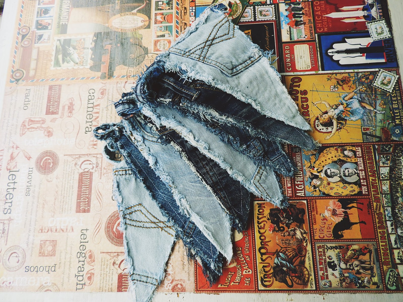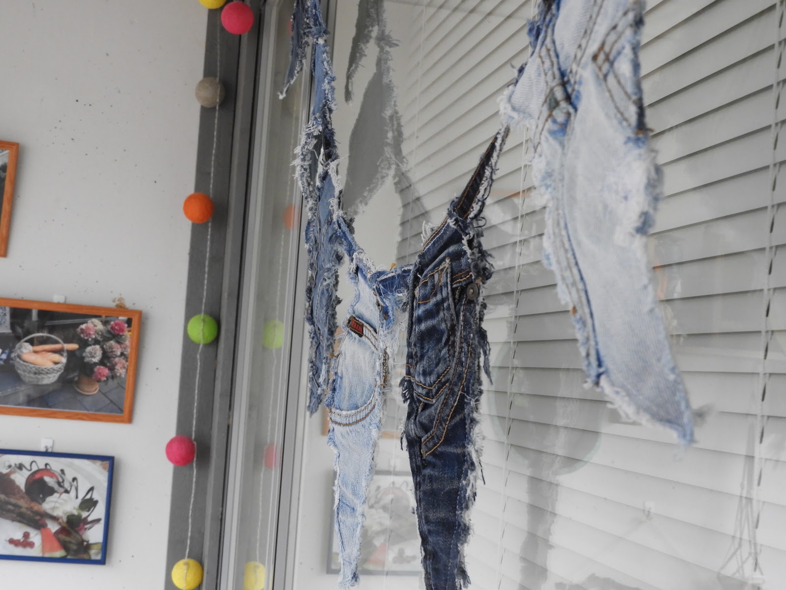 Olen kerännyt kestokauppakassiin kaikki farkkujen jämät mitä tuunauksista on jäänyt jäljelle. Näistä jämistä on tarkoitus tehdä erilaisia juttuja vaatteista muihin asioihin. Tällä kertaa valitsin farkkujen yläosia, joita jää aina jäljelle kun helpointa on käyttää lahkeet. Leikkasin noin 10x20cm kokoinen pala, se on aika hyvä koko viiriin. Viirit yhdistin sisäsauman osilla (niitä jää myös valtavat määrät yli tuunauksissa).