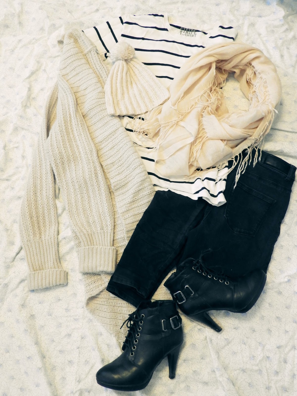 | Fida outletista löytyi neuletakki, raitapaita sekä mustat korkeavyötäröiset farkut |