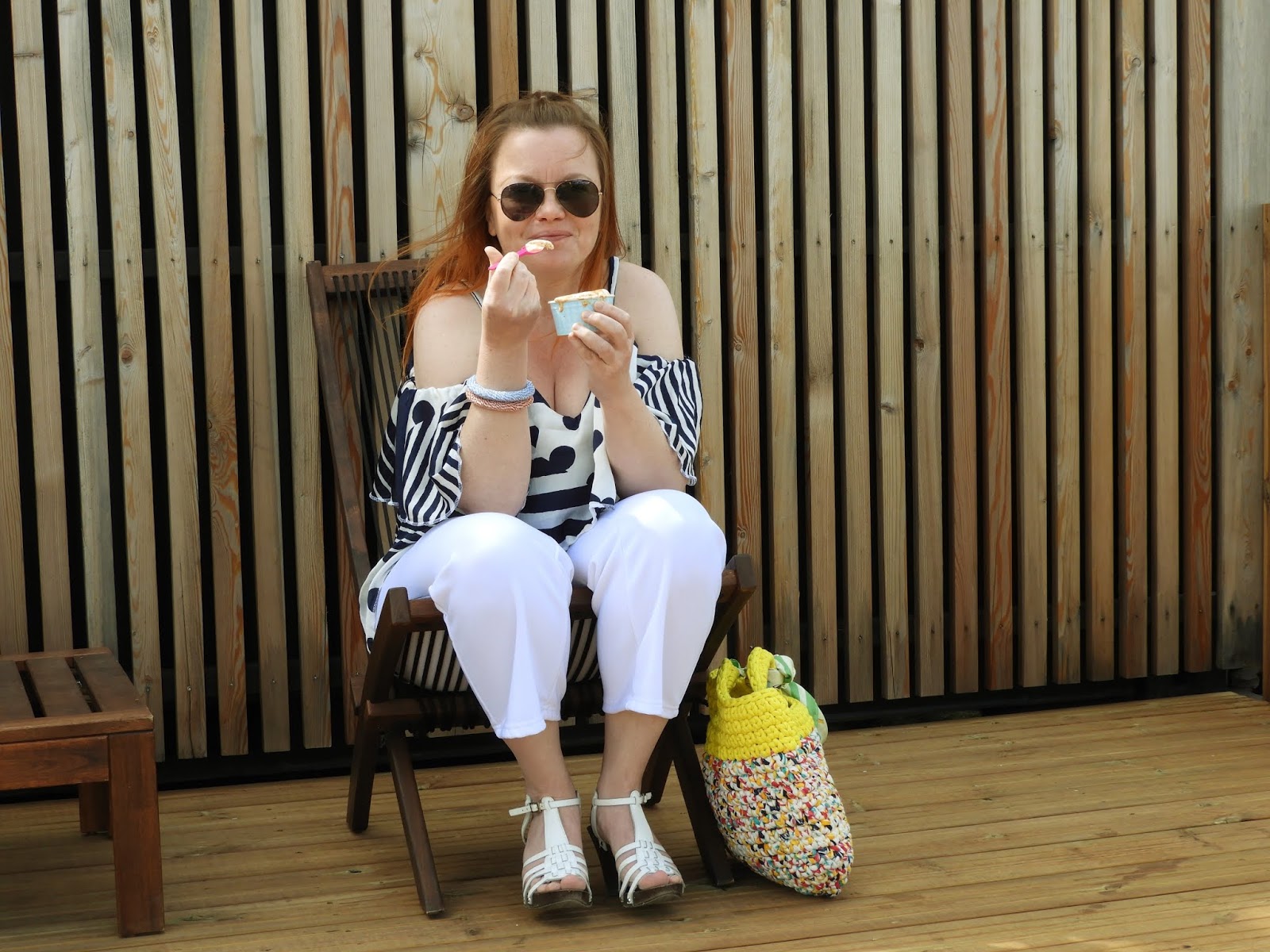 Tultiin tänne kävelylle ja tutustumaan ranta-alueeseen ja tietenkin kuvaamaan uutta toppiani ja muutenkin asuani, johon kuului Kierrätyskeskuksesta löytyneet housut, trikookuteesta virkattu laukku sekä itse tehty huivi. Toppi on tehty Burda easy v/s 2017 lehden kaavalla. Tässä lehdessä onkin paljon kaikkea kivaa, jotka olen suunnitellut toteuttavani tämän kesän aikana, jos vain saan ompelutilan nopeasti kasaan.