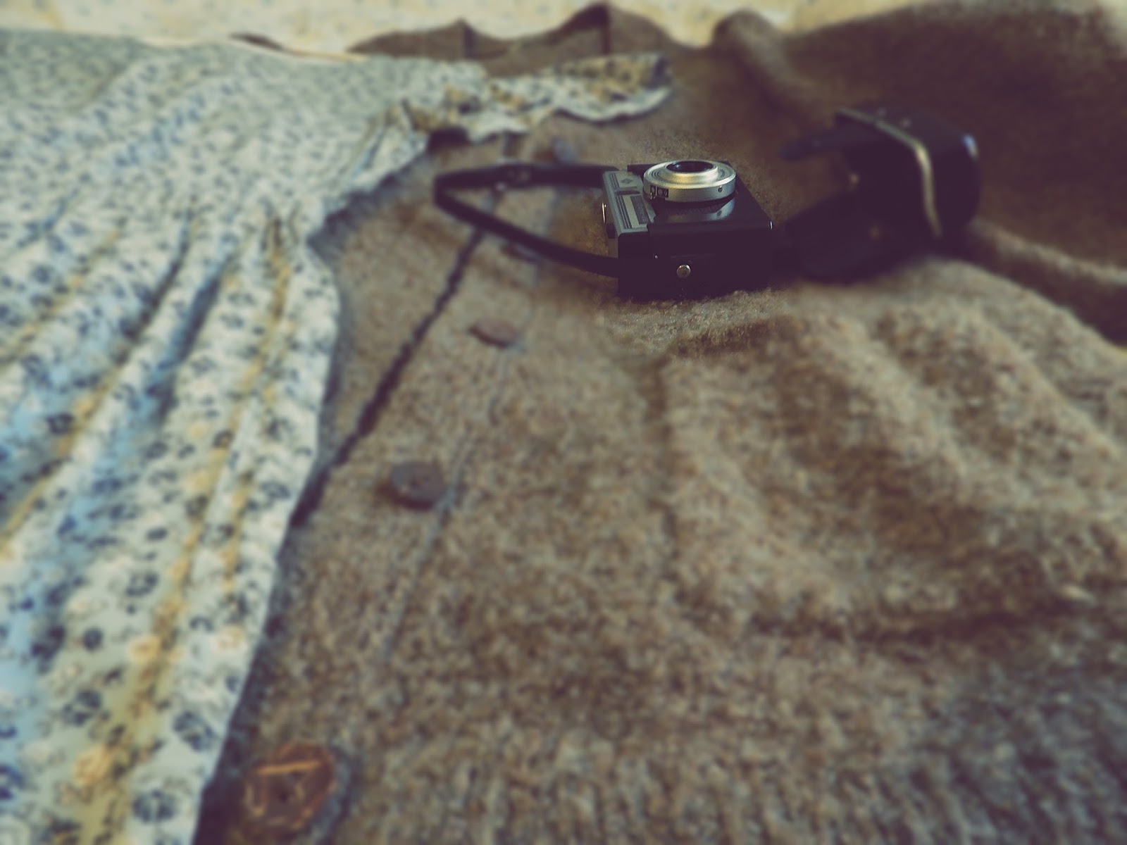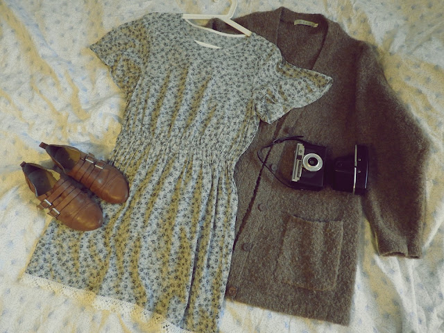 Mekon voi yhdistää monin tavoin mutta itse valitsin tietenkin nyt keväisen version, tosin äkkiä tämäkin on syksyversioksi muokattu kun laittaa sukkahousut ja nilkkurit. Mutta nyt valitsin ihanan Kierrätyskeskuksen ilmaisosastolta löytyneen ”pappaneuleen”, se on ihanan pehmeä, pinnalta nyppyinen, joka ei tässä lookissa haittaa yhtään. Aikaisempi ”pappaneule” onkin mennyt rikki ja viskasin sen tuunausläjään, joten voi olla, että palaan tähän asuun vielä syksyllä kun olen tuunannut jotakin kivaa pientä, joka sopii myös tähän lookkiin hyvin.
