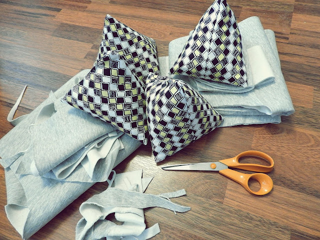 Yksi aamu kuitenkin tuli stoppi moiselle puuhalle ja aloin miettiä miten saisin sopivat painot käyttööni. Ei muuta kuin kaivelemaan kankaita ja löytyi joskus aikanaan Ikeasta ostettuja tilkkuja. Tilkut ovat jämäköitä ja paksuja, sopivat hyvin tähän projektiin. Tein painot käteen sopivaksi, sopivan mallisiksi ja täytin ne leikkuu -ja ompelujätteellä, näin sain niistä tukevat ja painavat. Toistaiseksi ovat olleet erittäin hyvät tähän hommaan. Painot ovat olleet käytössä muutaman kuukauden ja suunnitelmissa on ommella jossakin kohtaa näitä myös lisää. Myös pienempiä olisi tarkoitus tehdä. Saa silloin hyvin leikattua myös pieniä osia.
