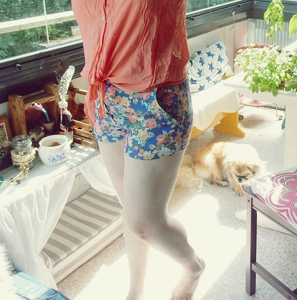 Nämä shortsit on ommeltu pienestä tilkun palasesta ja paita on löytynyt Kierrätyskeskuksen ilmaisosastolta. Käytin paitaa aika paljon muutama vuosi sitten ja on keväällä laitettu Hope- yhdistykselle. Näin ne minun vaatteeni kiertää. Minulla on muuten myös vaatteiden myynti olemassa täällä bloggerissa. En vain ole hetkeen jaksanut keksittyä siihen, nyt kesällä laitan sen aktiiviseksi ja toivon saavani näitä lumppujani pois nurkista. Kannattaa siis jäädä norkoilemaan…