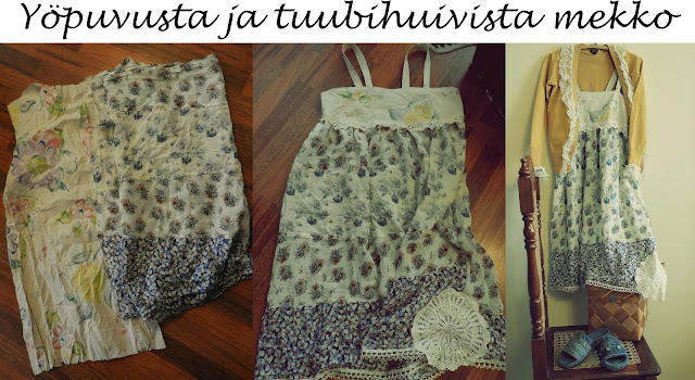 Lumppis-projekti on ollut loistava tapa saada uusia vaatteita materiaaleista, jotka eivät sellaisenaan enää toimi. En voi mennä vannomaan, että tuo hauska monikuvioinen helma olisi tuubihuivi mutta muutakaan en tähän hätään keksinyt. Olen kaivanut sen Fidan Outletista aikanaan kun ensimmäisen kerran siellä kävin kaivelemassa. Yöpuvun housut ovat omani, jotka olen alunperinkin tehnyt vanhasta lakanasta. Mekko on kerran jo ollut täällä esillä ja kyseisen postauksen jutut tullaan kuvaamaan minun päälläni tämän kesän aikana.