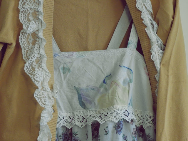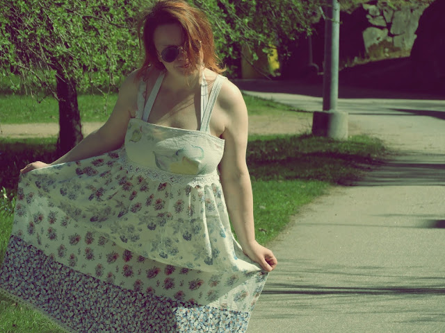 Lumppis-projekti on ollut loistava tapa saada uusia vaatteita materiaaleista, jotka eivät sellaisenaan enää toimi. En voi mennä vannomaan, että tuo hauska monikuvioinen helma olisi tuubihuivi mutta muutakaan en tähän hätään keksinyt. Olen kaivanut sen Fidan Outletista aikanaan kun ensimmäisen kerran siellä kävin kaivelemassa. Yöpuvun housut ovat omani, jotka olen alunperinkin tehnyt vanhasta lakanasta. Mekko on kerran jo ollut täällä esillä ja kyseisen postauksen jutut tullaan kuvaamaan minun päälläni tämän kesän aikana.