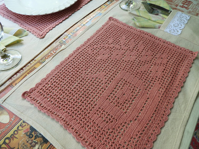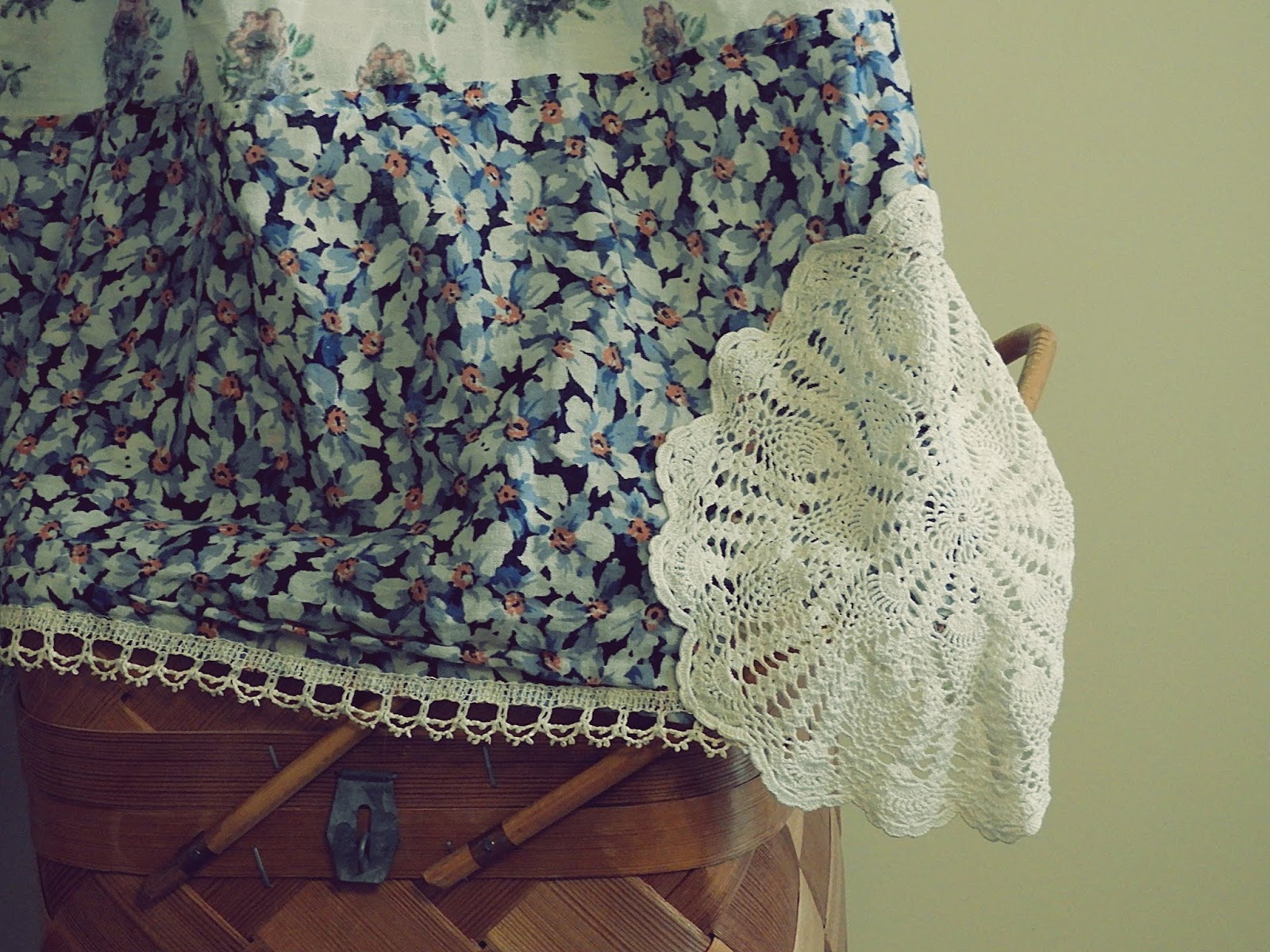 Löysin paksuhkoa puuvillaa olevan pussin, pussi oli aika iso kokoinen ja sellaisenaan siitä ei ole minulle mitään hyötyä, joten otin sen seuraavaksi projektiksi. Siitä sai näppärästi pari pöytätaplettia, minulle ja miehelleni. Virkatut koristeet löytyi keittiöstä, nekin äitini nekemiä. Niitä on niin paljon, että pari voi hyvin hyödyntää näin myös. Silppulaatikosta löytyi pari lyhyttä pätkää pitsiä, joka sopii projektiin oikein hyvin. Ohjeet pöytätableteihin löytyy täältä. Helppo tehdä mutta ompelukonetta täytyy osata käyttää, sen verran paljon on ommeltavaa.
