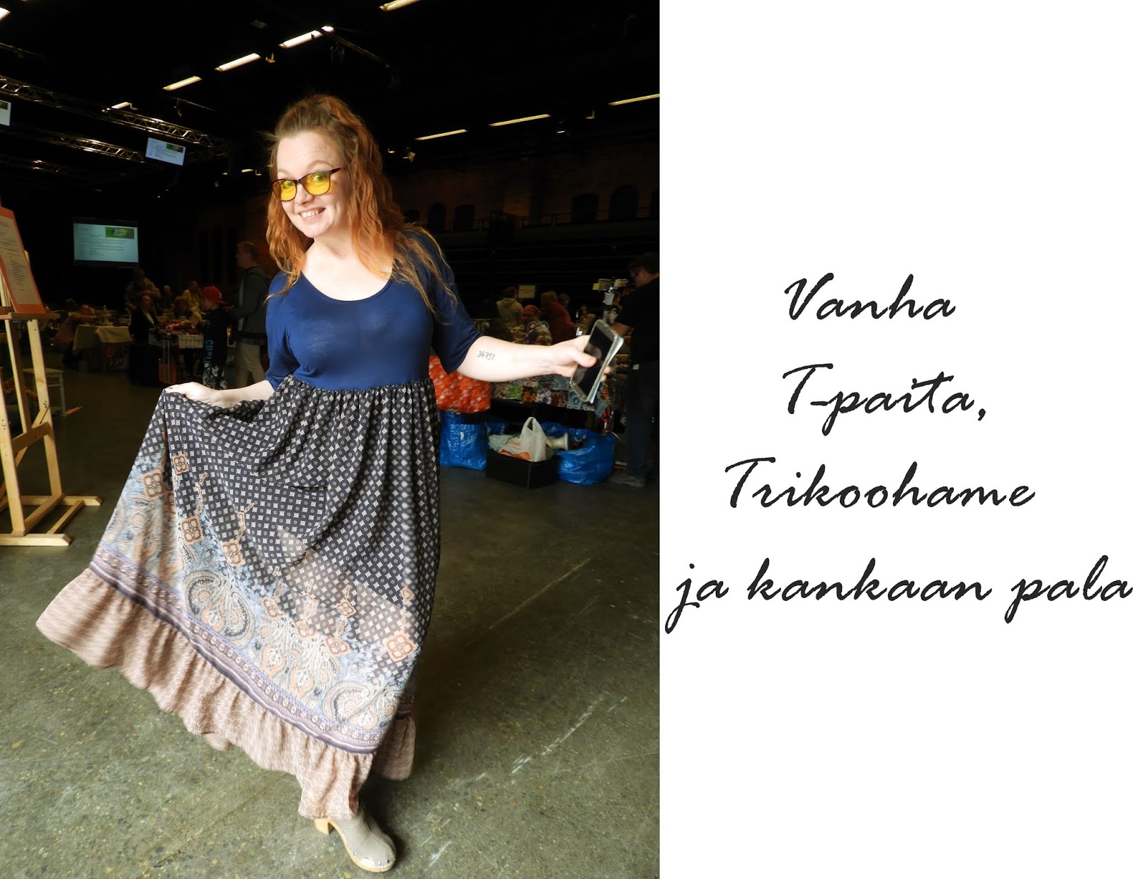 Kun oltiin lähdössä Tekasin-festareille, jouduin hetkeksi pysähtymään ja miettimään, että mikä sopisi kyseiseen tilaisuuteen kaikkein parhaiten ja aika nopeasti huomasin, että se on juurikin tämä mekko, joka sopii joka tavalla tuonne tapahtumaan. Kaikki vaatteen osat ovat jämiä, osat on trikoohametta (vuoreksi), t-paidan yläosa sekä shifonkikankaan palanen. Kaikki osat käytettiin, mitään ei jäänyt jäljelle, paitsi ompelujäte, minisilput, joista muuten voi tehdä vaikka lankaa halutessaan ja neuloa vaikka maton. Itse en ole siihen vielä ryhtynyt, mutta meinaan tehdä kun tyynyjä on jo niin paljon, ettei niitä enää halua tehdä.