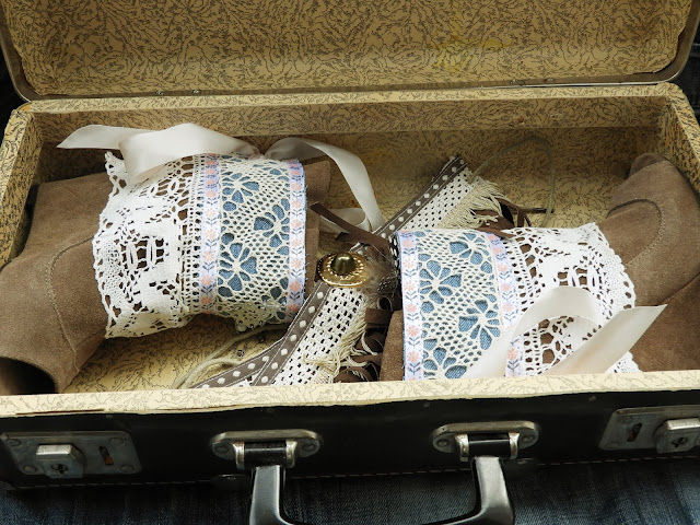 En tiedä kuinka moni muistaa kun viime vuonna ompelin Kierrätyskeskuksen ilmaisosastolta löytyneille kengille koristeet varteen. Lupailin jo silloin, että teen näitä enemmän ja tosiaan tulen tekemään näitä enemmän. Nyt koristevaihtoehdot lisääntyivät yksillä hiukan romanttisimmilla koristeilla. Tämä on muutenkin tosi mielenkiintoista hommaa ja aika terapeuttista myös. Koristenauhojen pätkät saa hyvin hyötykäyttöön ja myös käyttämättömät / rikkinäiset korut pääsee mukaan näin. Näitä voi tehdä lukuisia ja erilaisia.