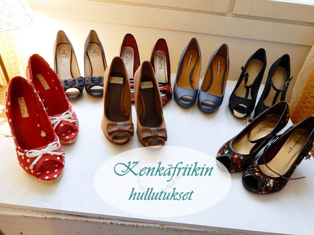 Eilisessä postauksessa jo myönsin, että olen kenkähullu, todellakin hullu, mutta se ei ole vain näiden kenkien ympärillä olevaa hulluutta vaan myös siitä miten niitä säilytän. Osa on koristeina hyllyillä, osa omassa laatikossa, nämä kengät ovat omassa matkalaukussa. Kyseinen laukku on muuten sellainen, jonka jossain kohtaa myös tuunaan sisältä enemmän näihin kenkiin sopivaksi.