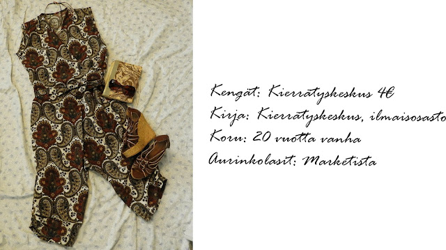 Tämän tyylinen lakana huutaa täysillä jotakin hyvin boheemia ja erillaista ja tämä jumpsuit on juuri sellainen. Kietaisua, isoa kuviota ja rentoa. Tämä on sitä minun juttua päästä varpaisiin. Ja malli on juuri sellainen, mitä voi tällainen tuhdimpikin tyttö käyttää.